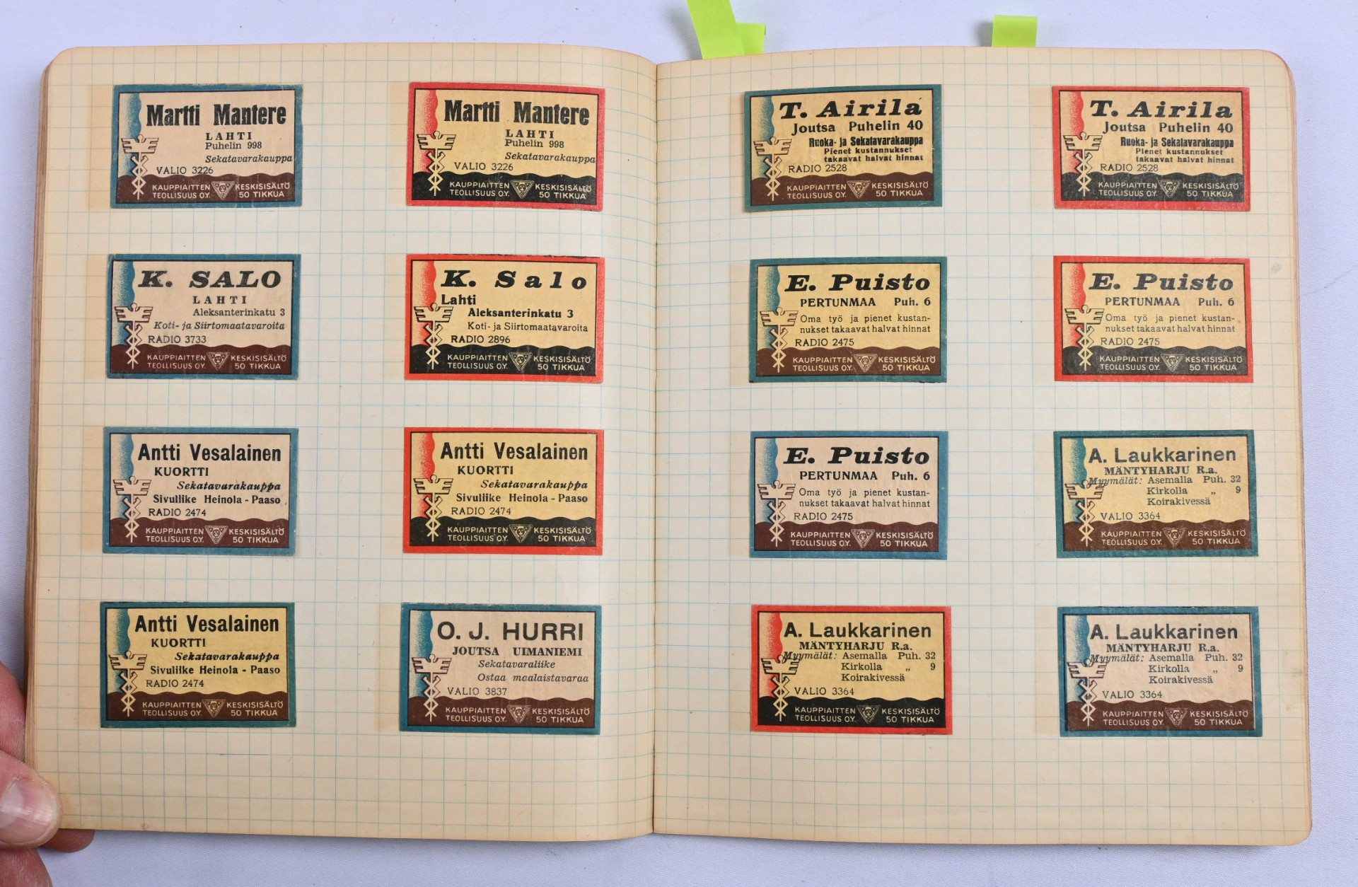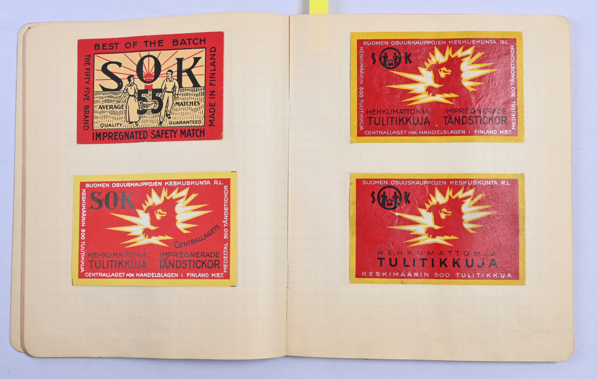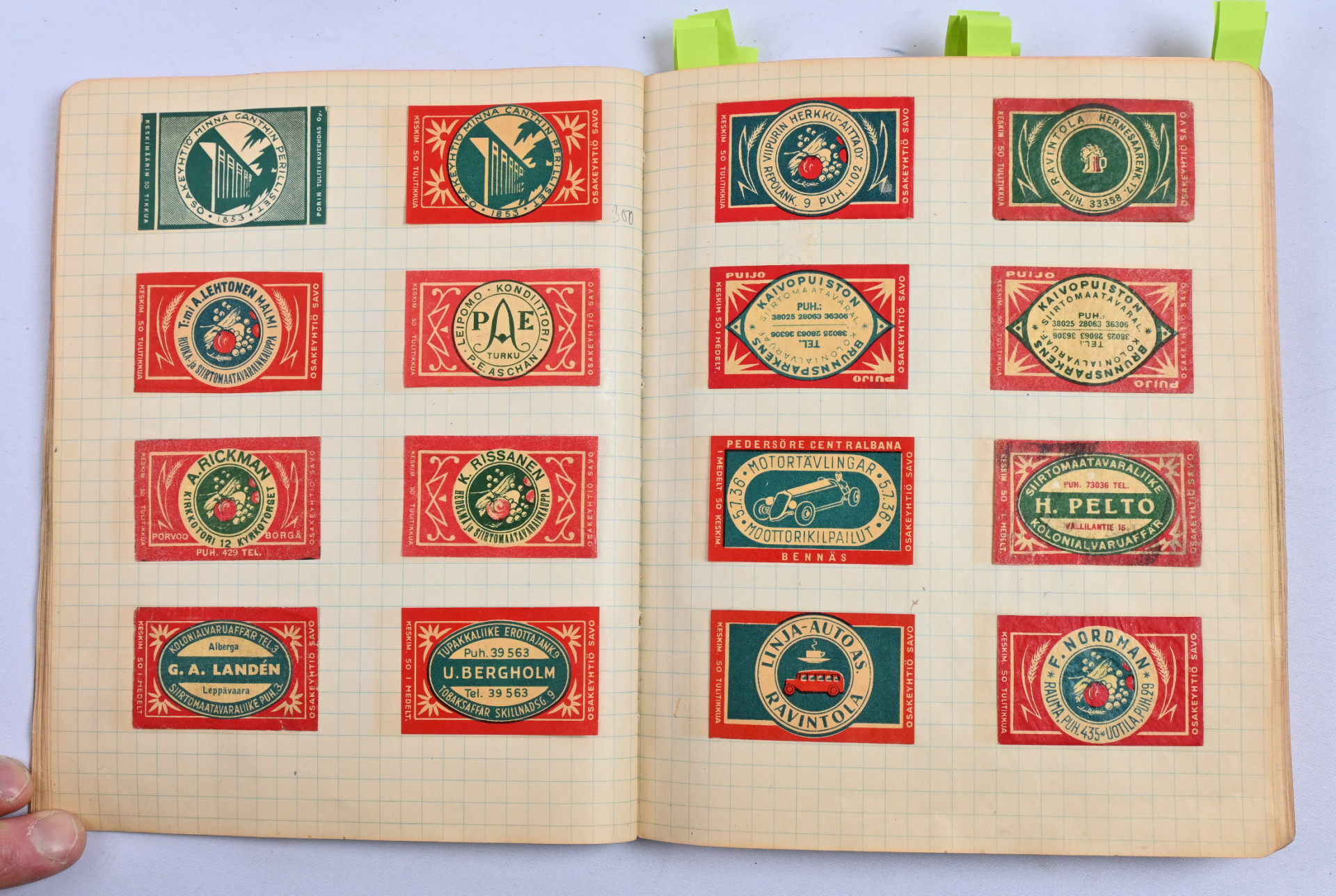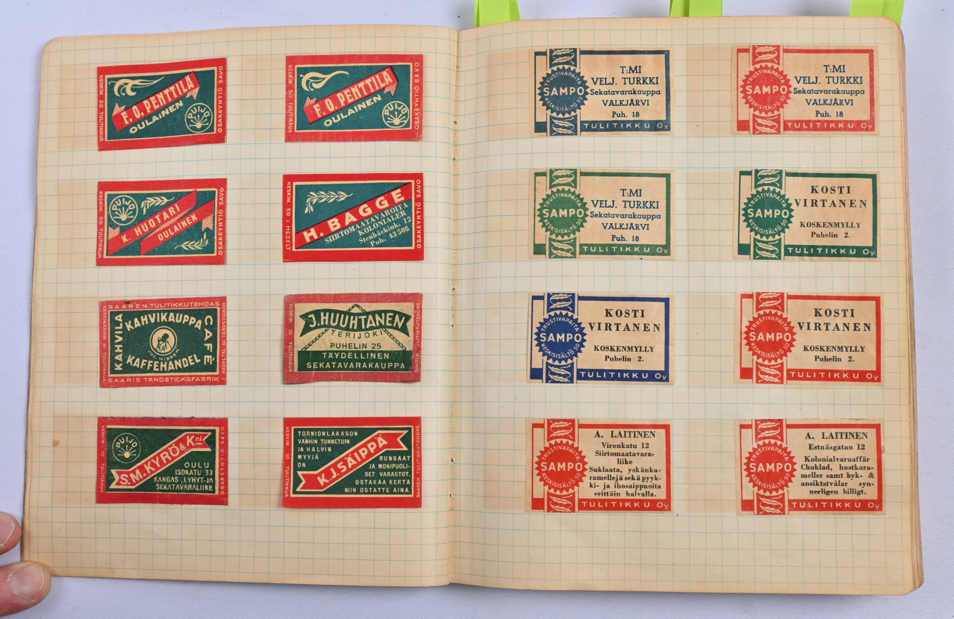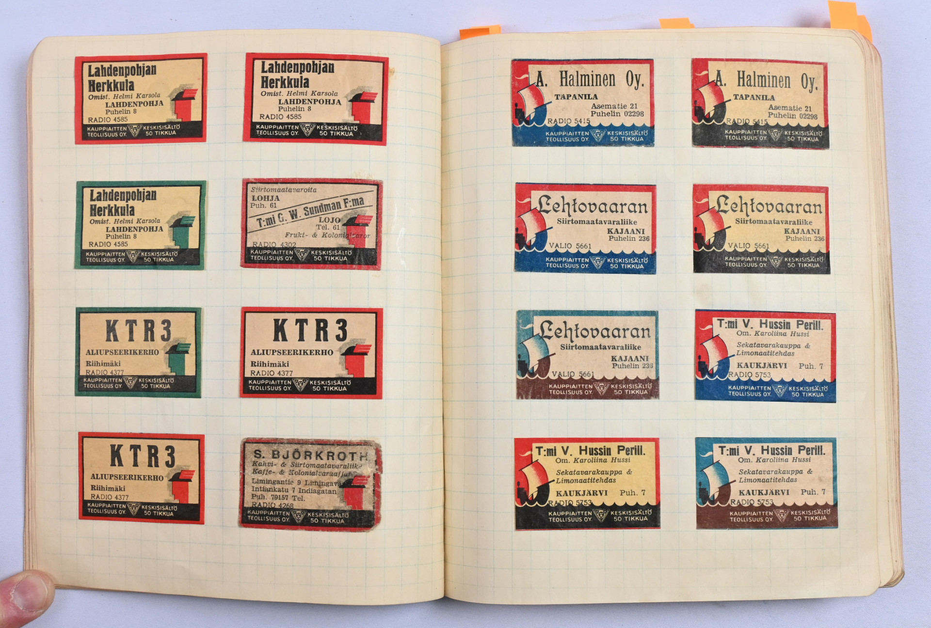 Vanhoja tulitikkuetikettejä upea vanha, 1960-luvulla tehty kokoelma neljässä vihkossa. Yli 3000 ilmeisesti pääasiassa erilaista etikettiä, vain vanhaa. Lähinnä kauppiasetikettejä, mutta myös vähän muutakin (vientietikettejä, isokokoisia). Kiinnitetty sivuille pienillä liimatipoilla ja irtoavat siististi rikkoontumatta. Erittäin monipuolinen, myös runsaasti (noin 250) luovutettua aluetta. Tilaisuus. Nähtävä! .