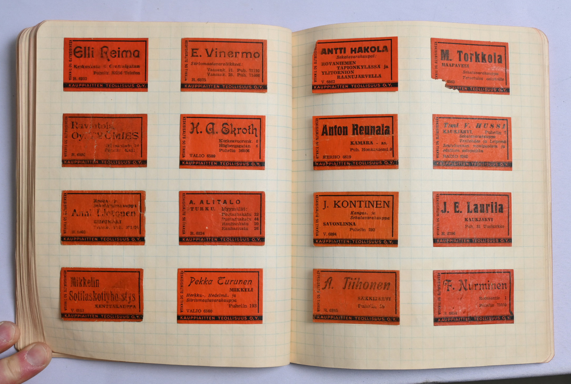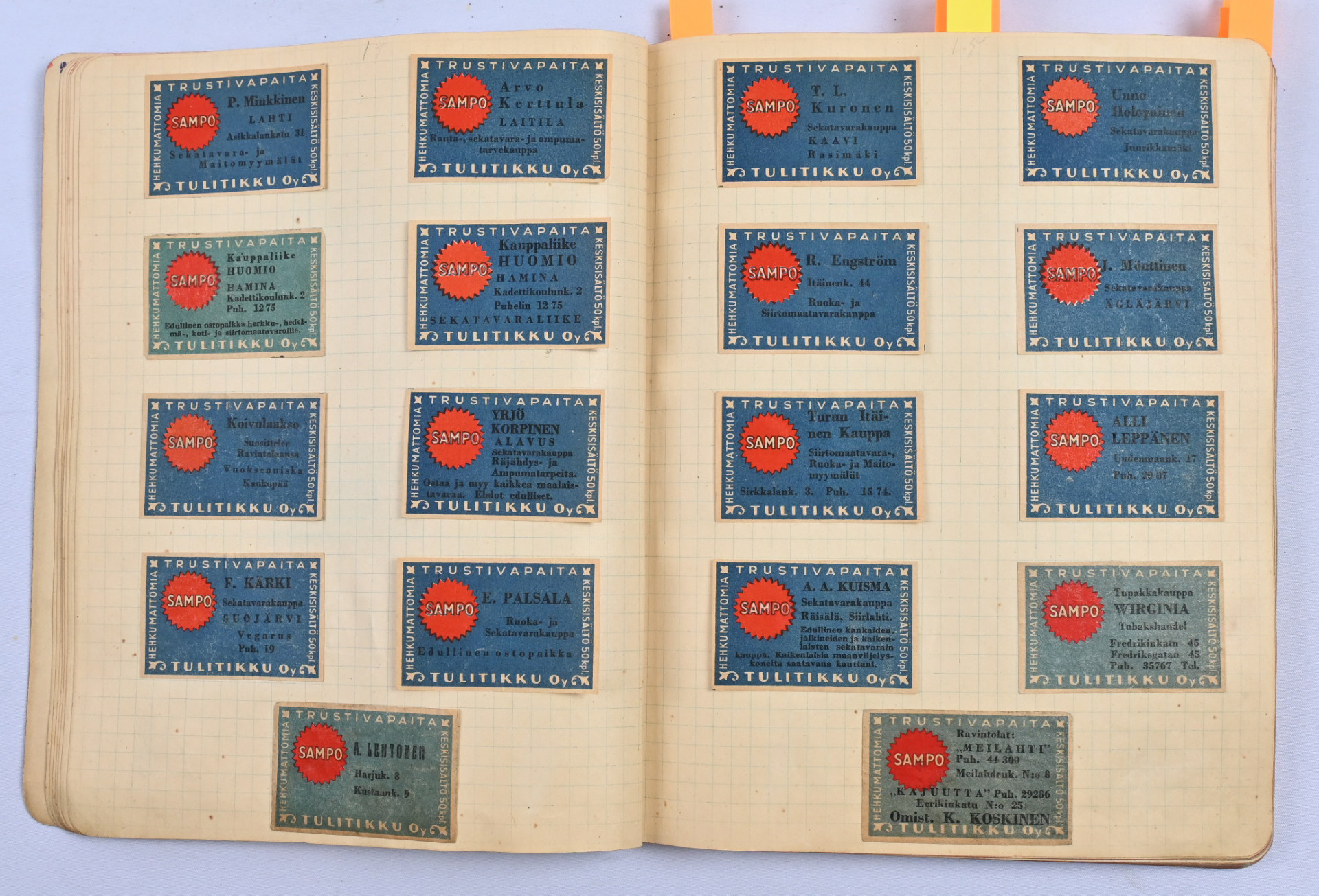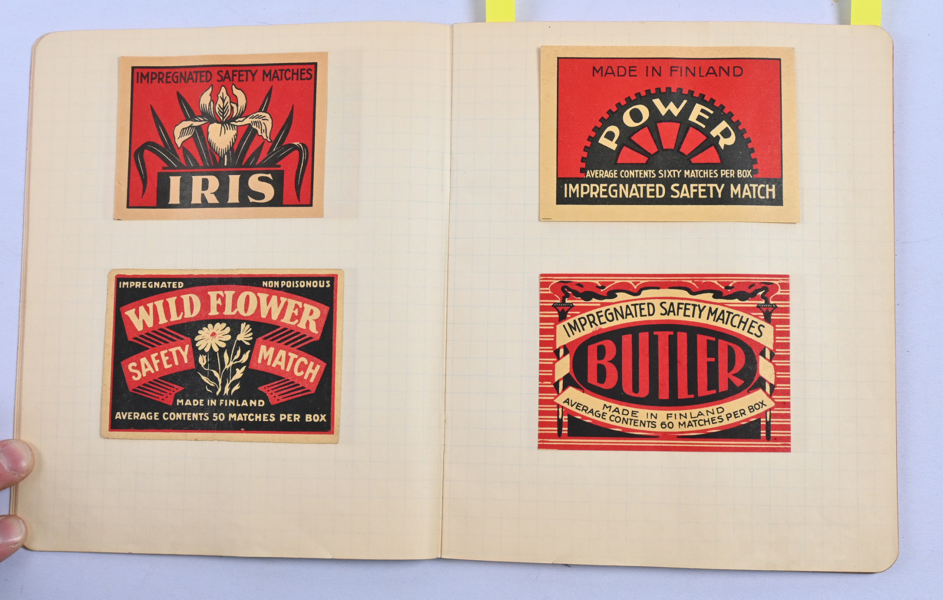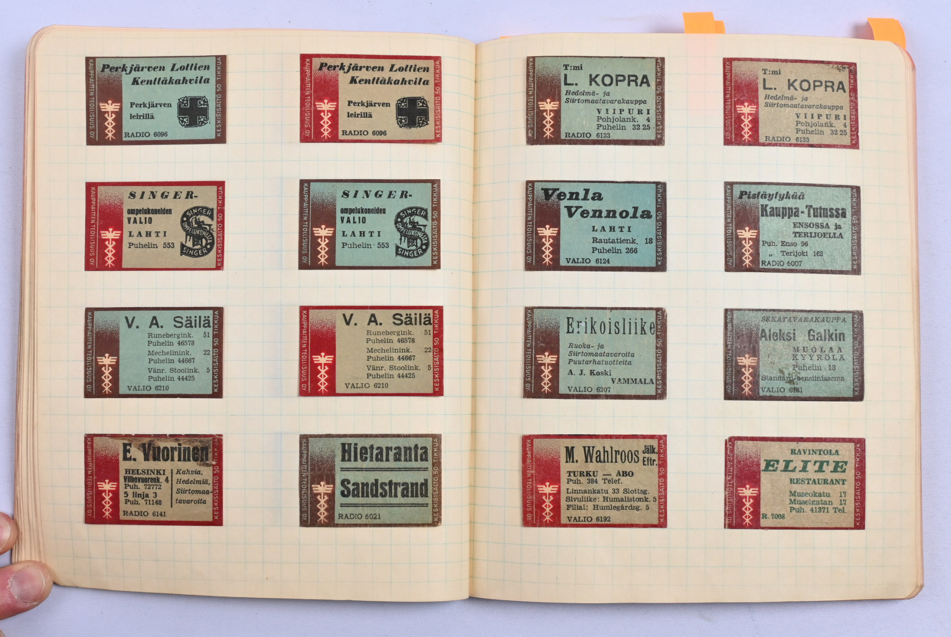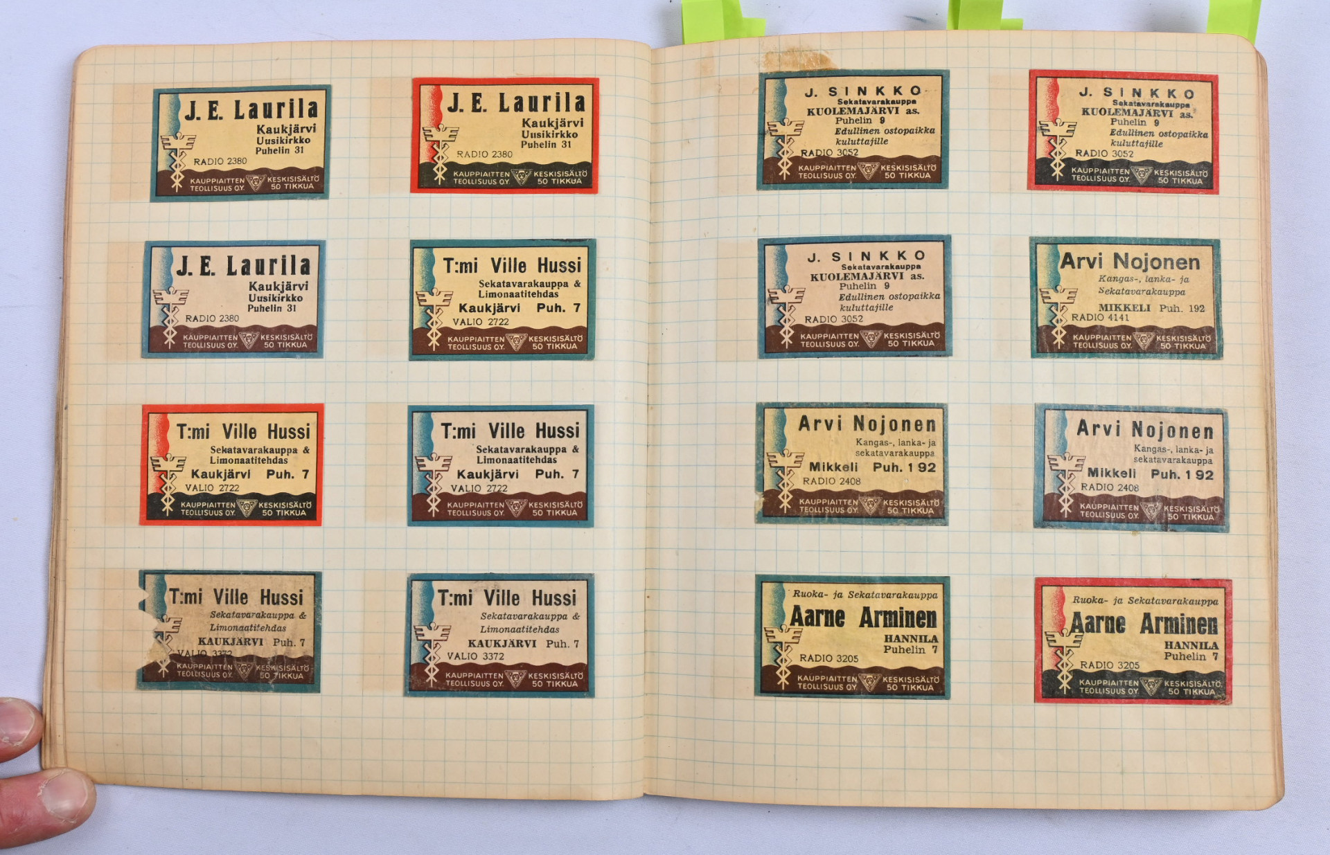 Vanhoja tulitikkuetikettejä upea vanha, 1960-luvulla tehty kokoelma neljässä vihkossa. Yli 3000 ilmeisesti pääasiassa erilaista etikettiä, vain vanhaa. Lähinnä kauppiasetikettejä, mutta myös vähän muutakin (vientietikettejä, isokokoisia). Kiinnitetty sivuille pienillä liimatipoilla ja irtoavat siististi rikkoontumatta. Erittäin monipuolinen, myös runsaasti (noin 250) luovutettua aluetta. Tilaisuus. Nähtävä! .
