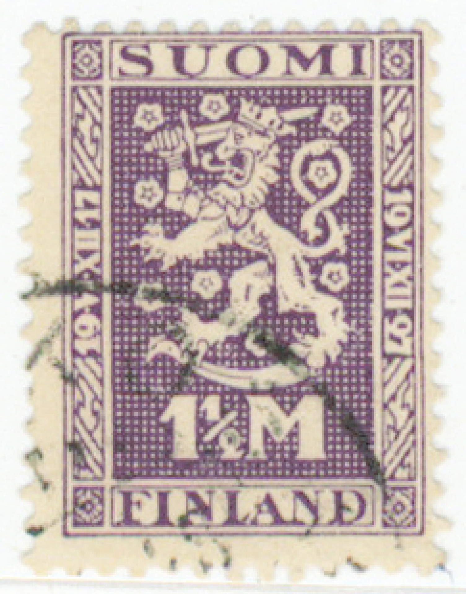 1927 Itsenäisyys 1½ markkaa W3 erittäin harvinainen leimattu. Joku hieman lyhyt hammas (L. 125W3)