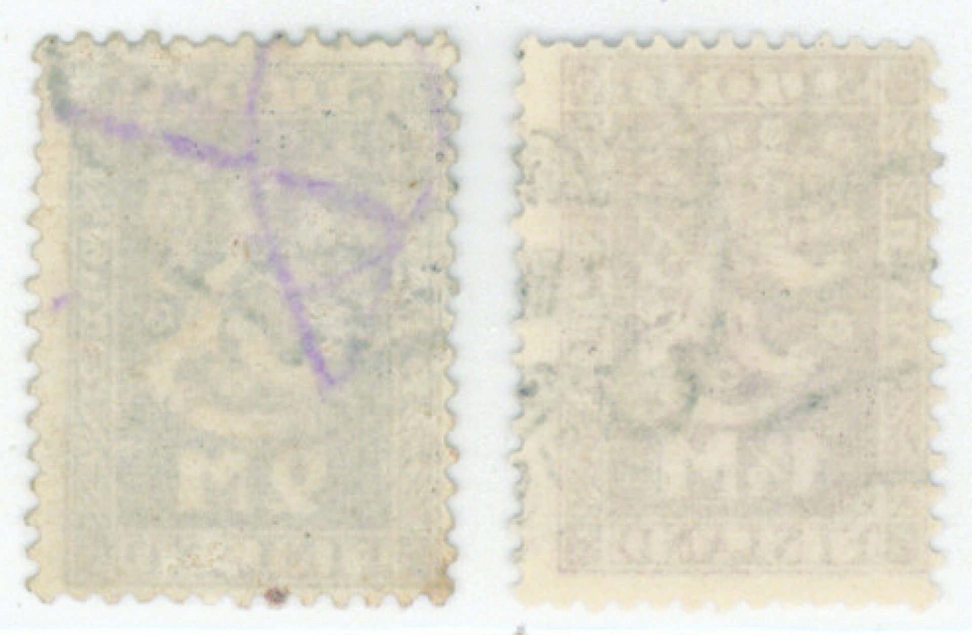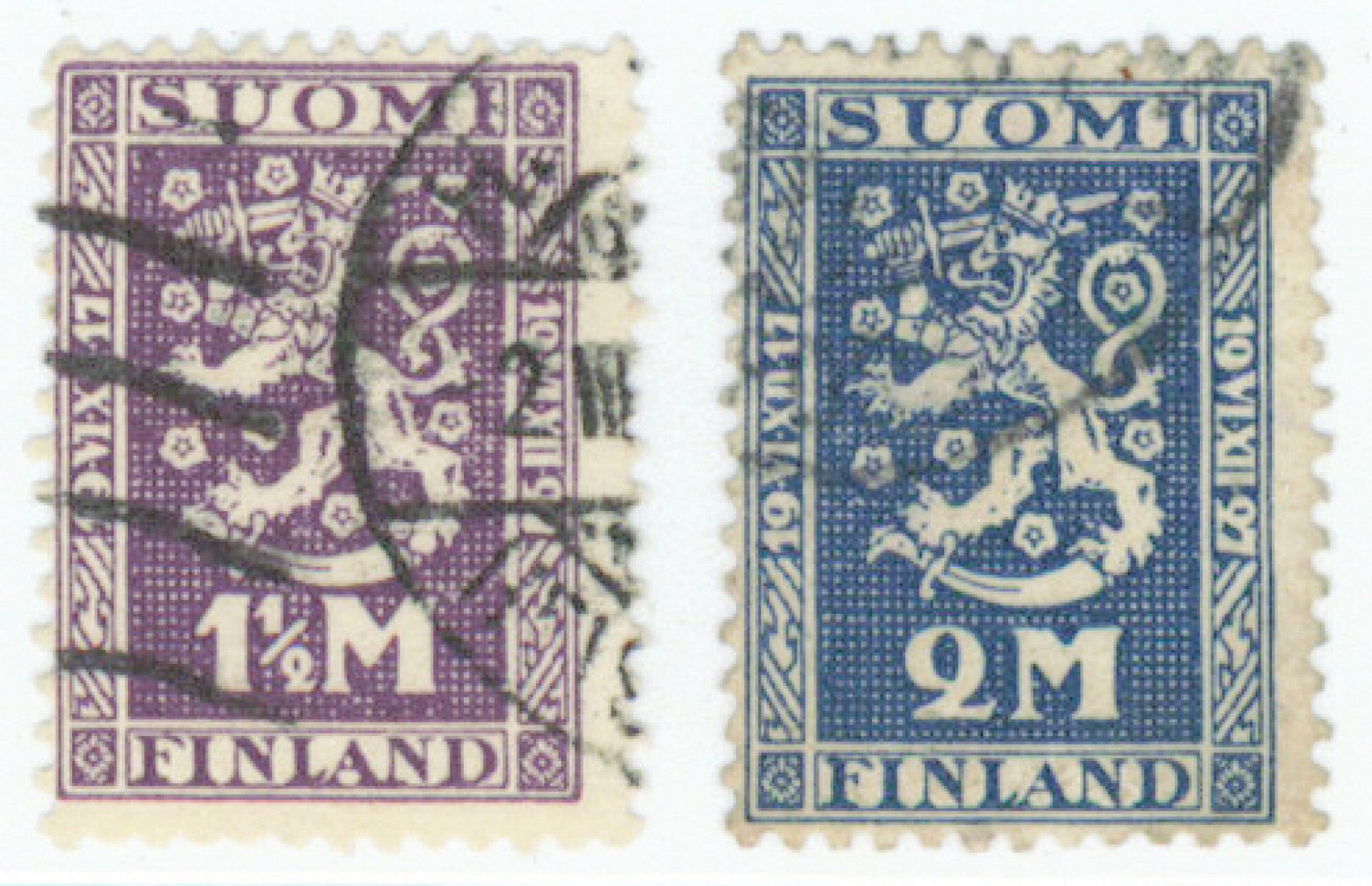 1927 Itsenäisyys W4 sarja leimattuna. Toisessa merkissä takana hiukan kosmoskynän jälkeä ja lyhyt hammas