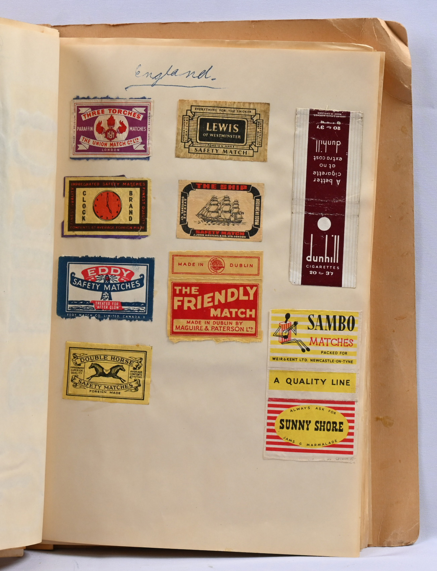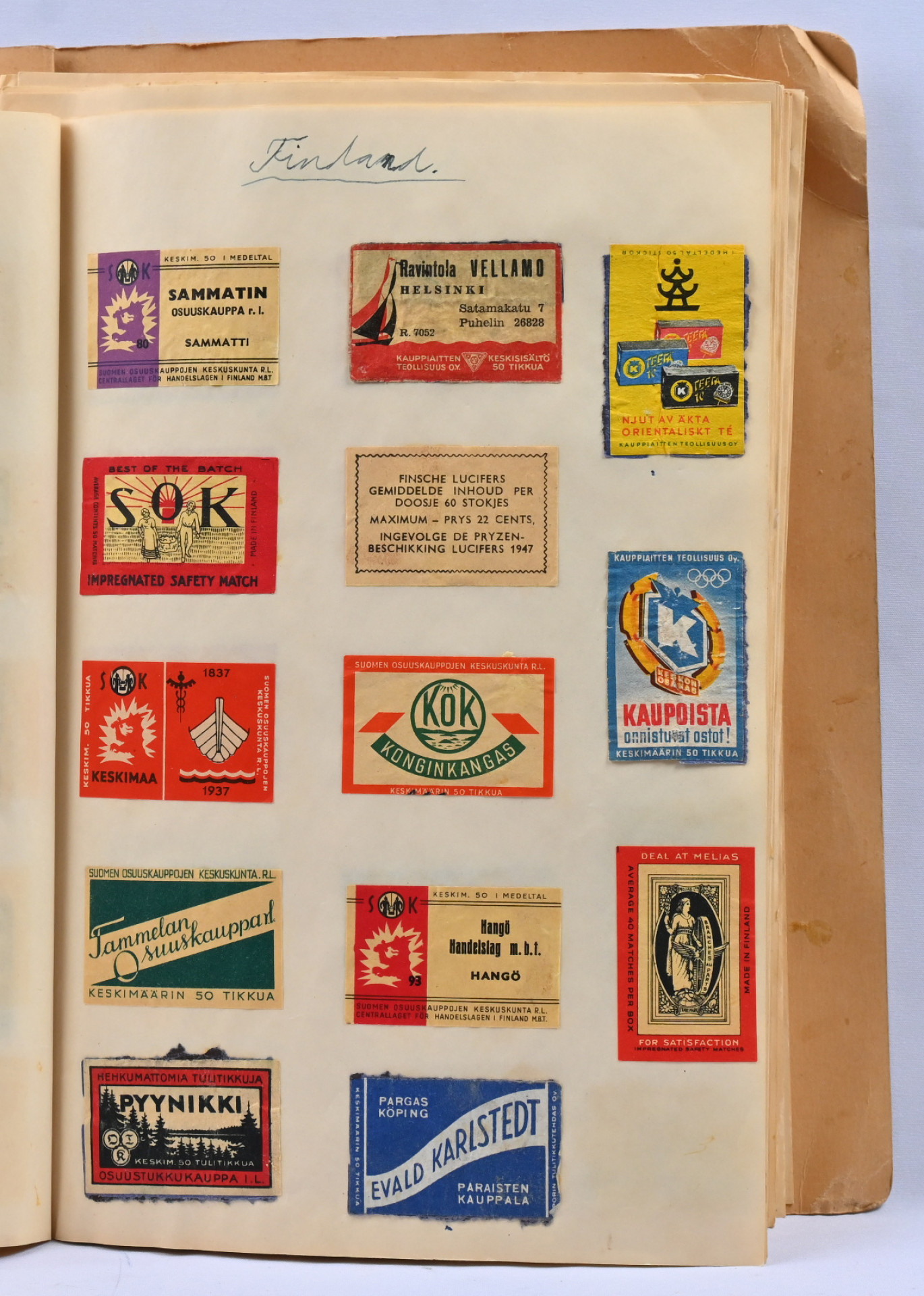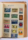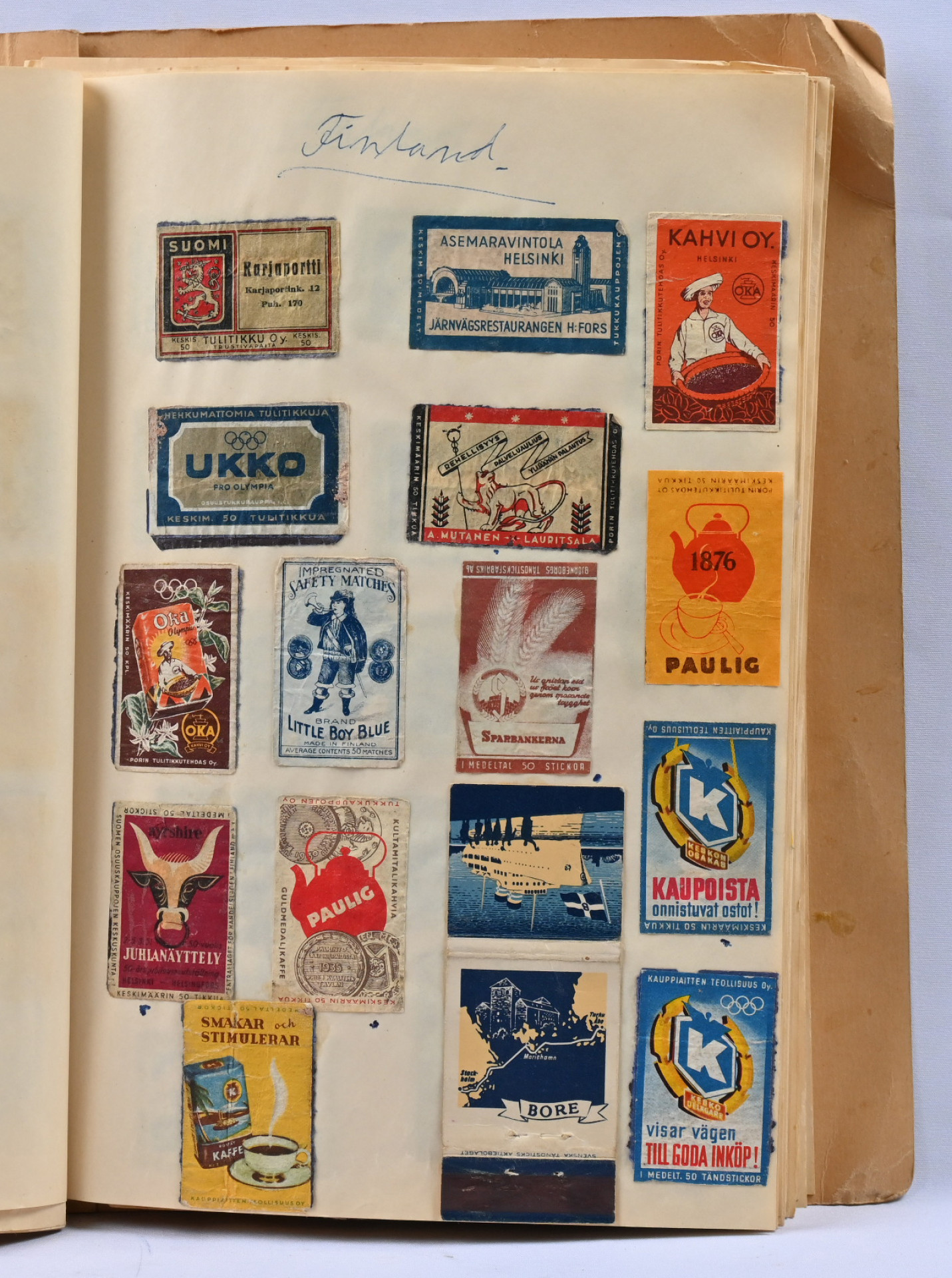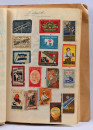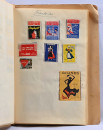 Vanhoja tulitikkuetikettejä vihkossa, liimalla kiinni. Suomalaisia ja ulkomaalaisiakin