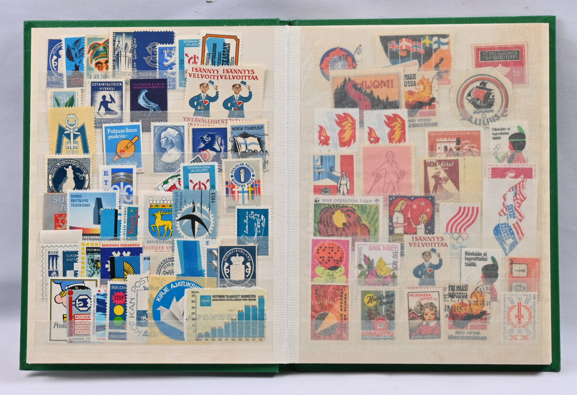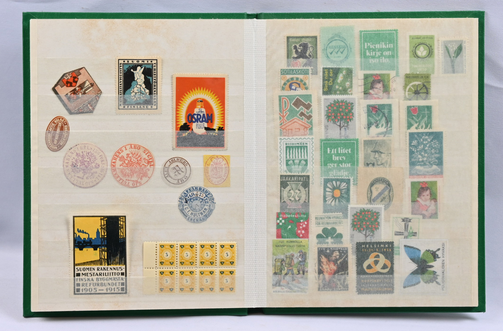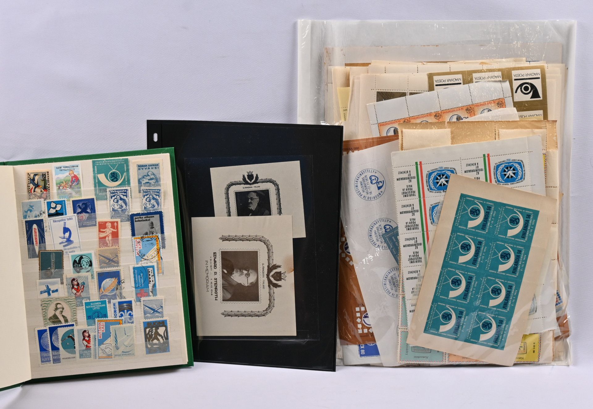 Kirjeensulkijoita, joulumerkkejä, paperisinettejä erä. Lisäksi pari hyvää muistoarkkia Hiltula 1938 ja Stenroth 1947