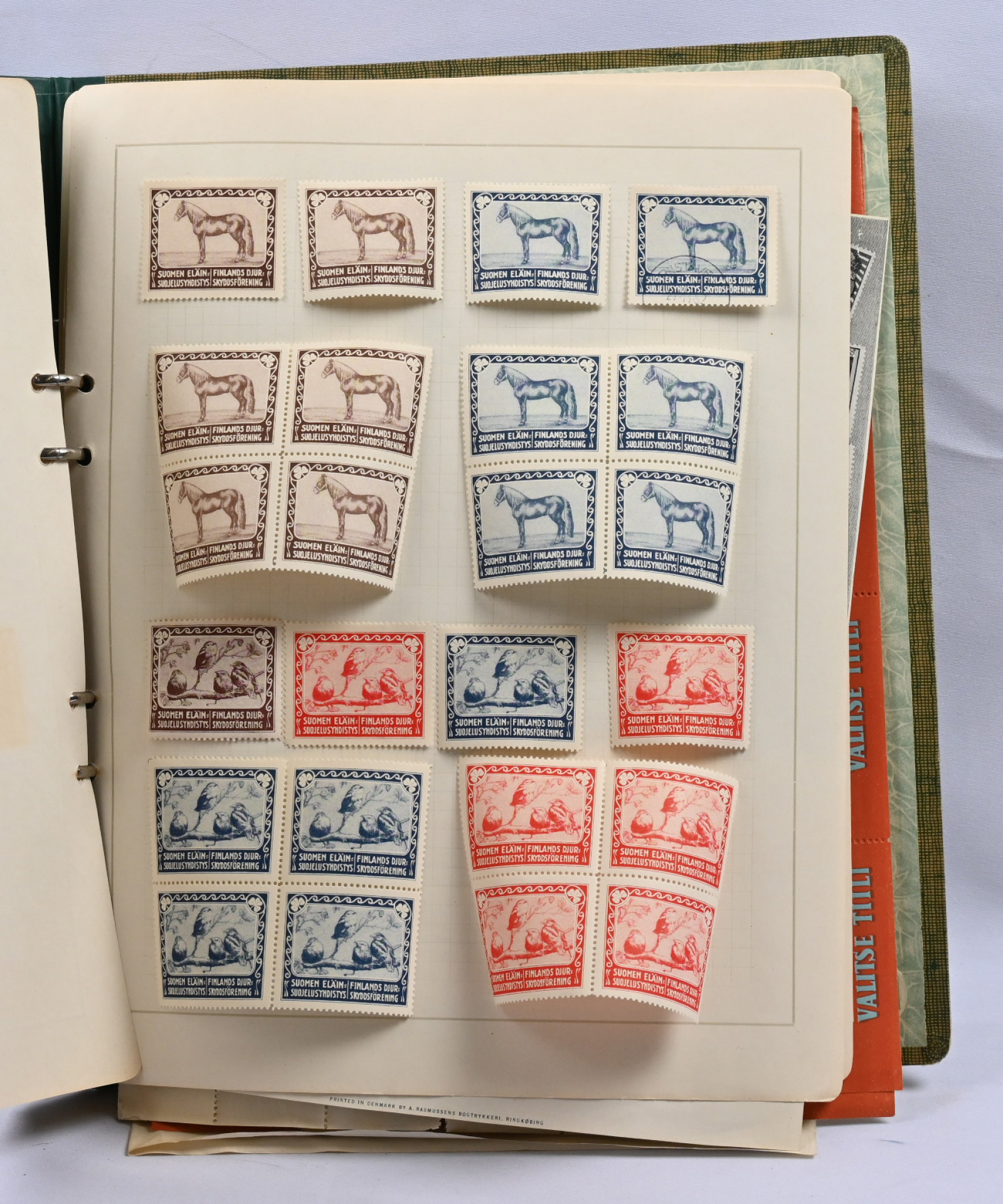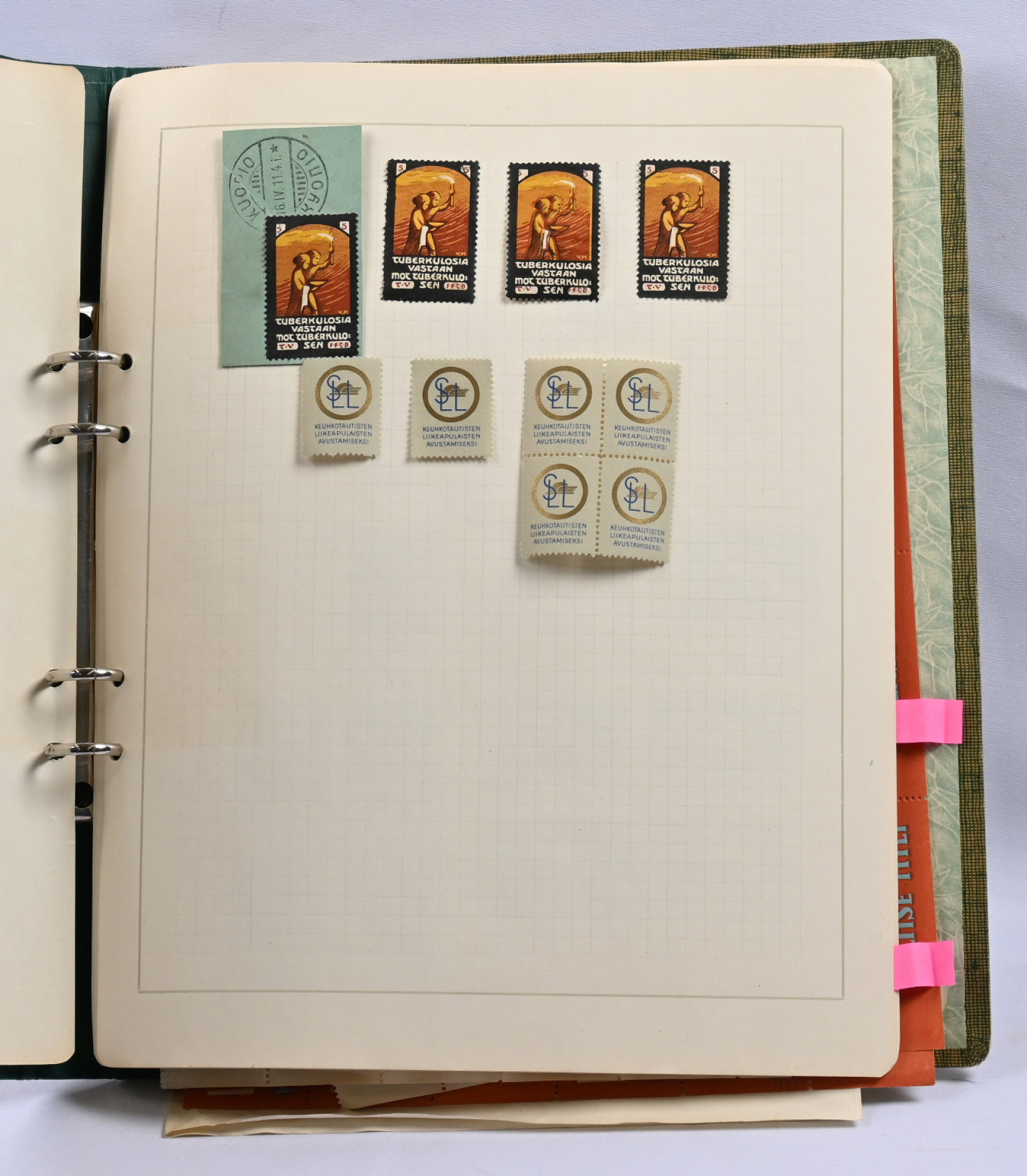 1912 - 1948 pieni kokoelma joulumerkkejä ja muita kirjeensulkijoita kansiossa. Myös vähän lisämateriaalia joulumerkkejä ja isompi erä kirjeensulkijoita, paperisinettejä ja ostokortteja