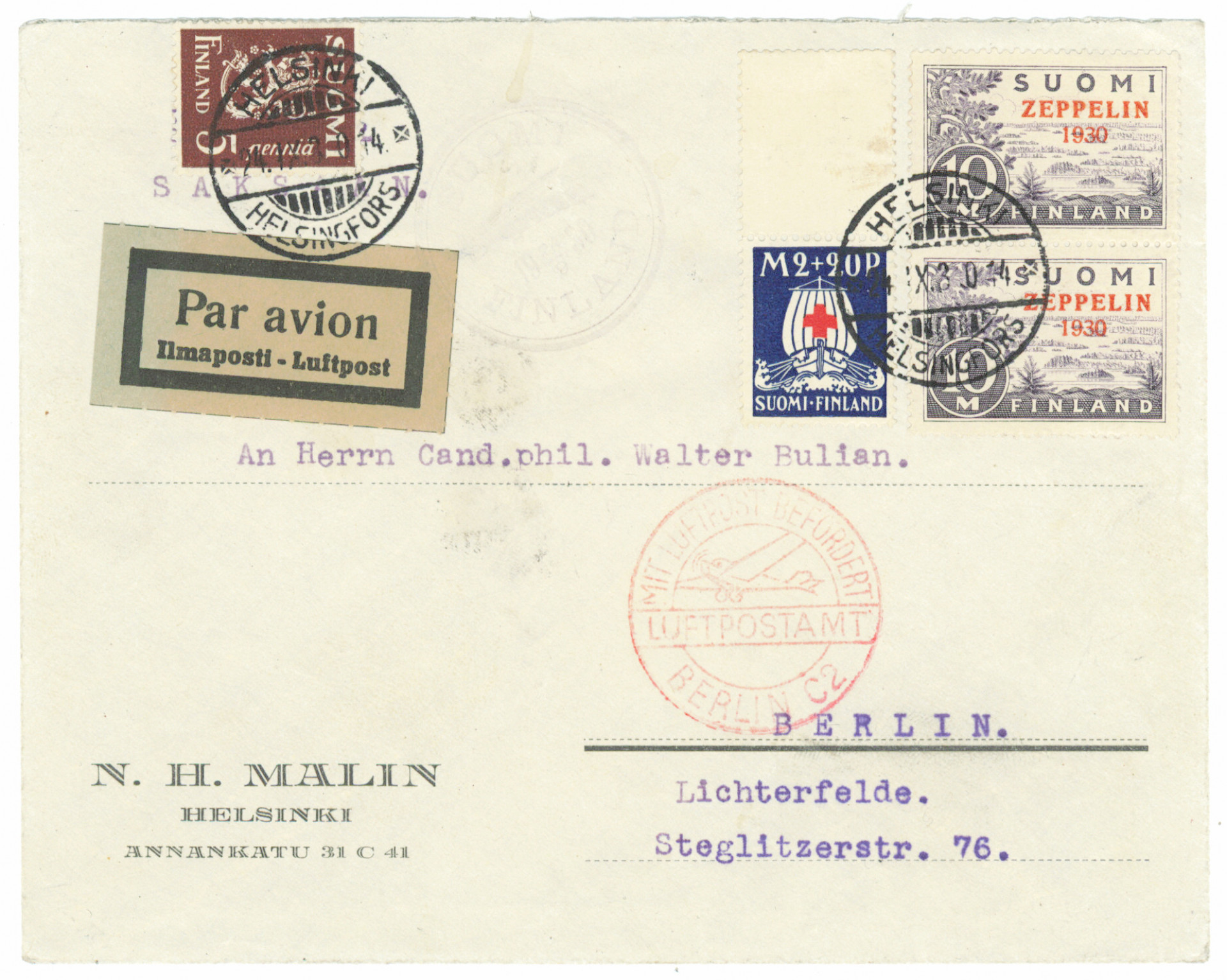 Zeppelin pari + 1930 punaristi 2 markkaa kuorella Saksaan