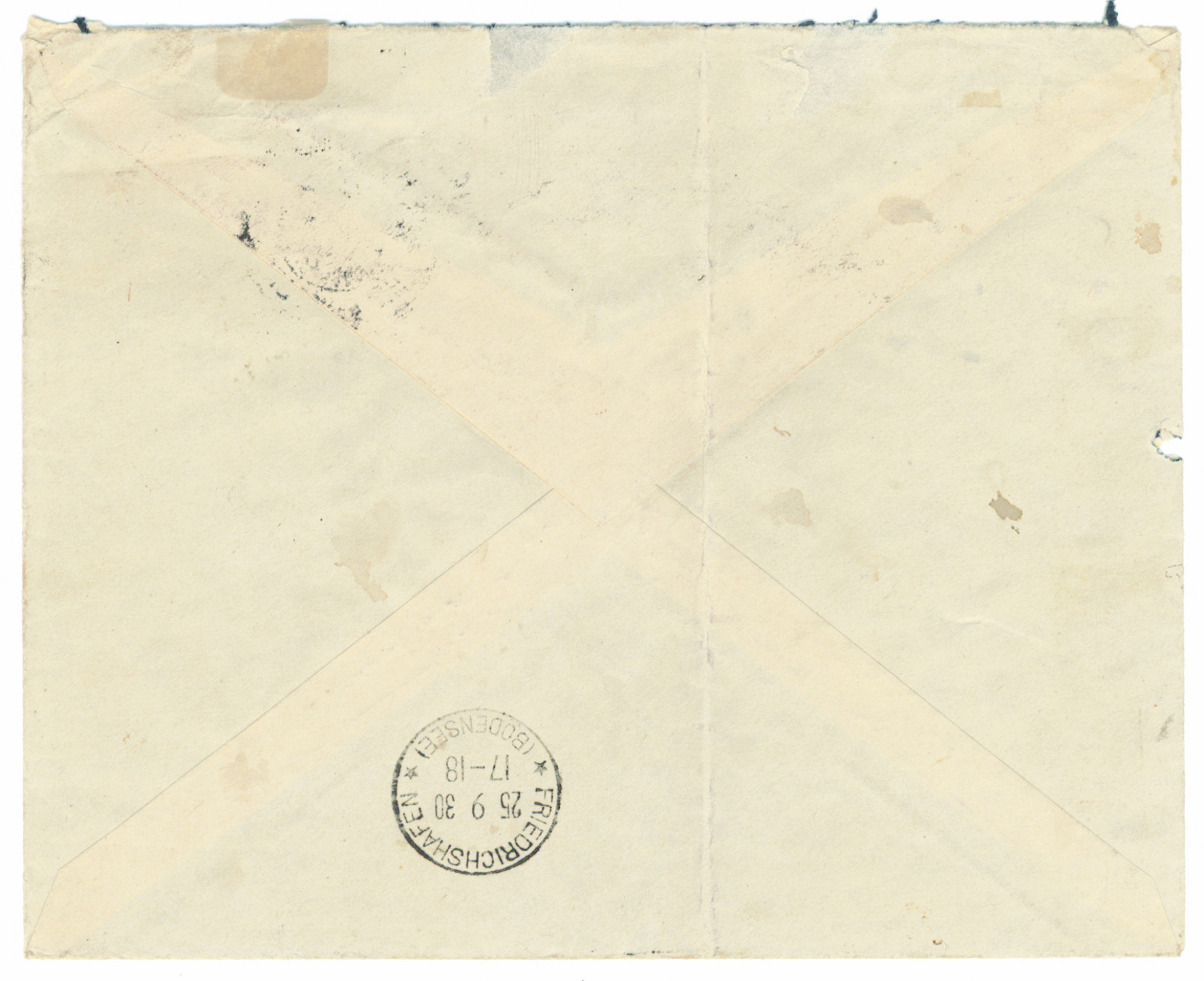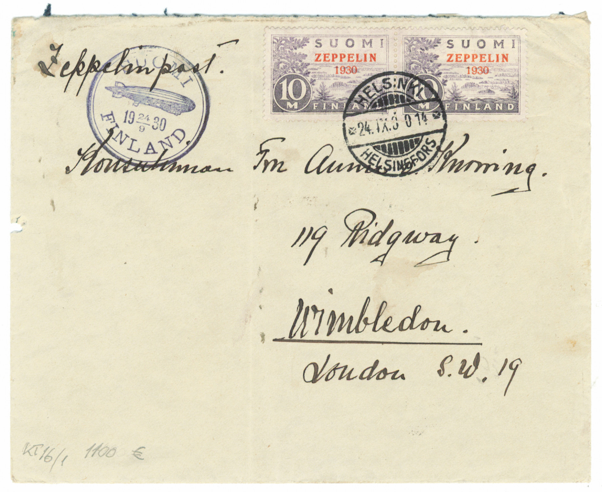 Zeppelin, kaksi merkkiä kuorella Englantiin. Kuoressa taitteita ja toisessa merkissä vähän vikaa