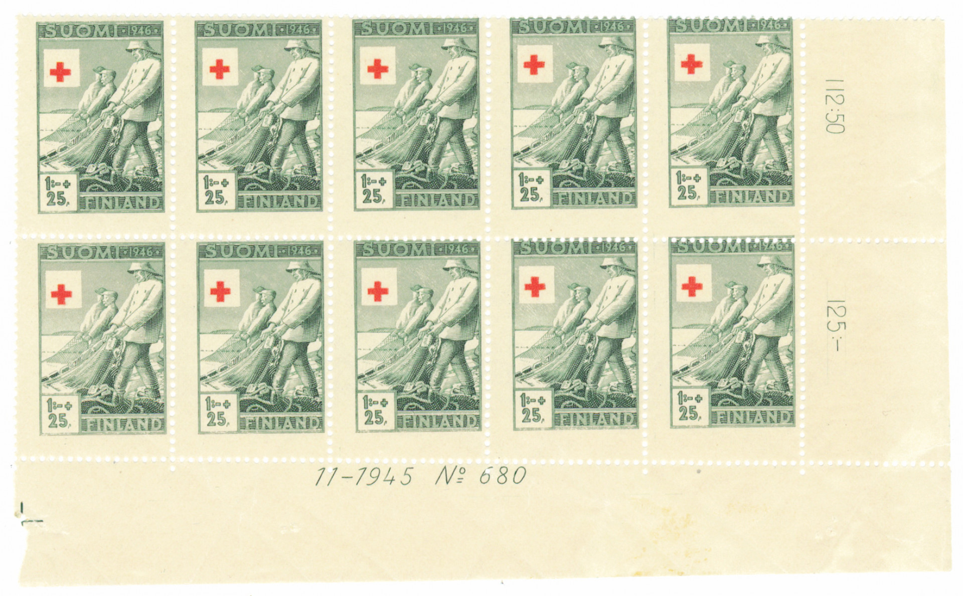 1946 1 markka hieno 10-ryhmä arkin kulmasta, jossa näkyy merkkikuvan upea siirtyminen!