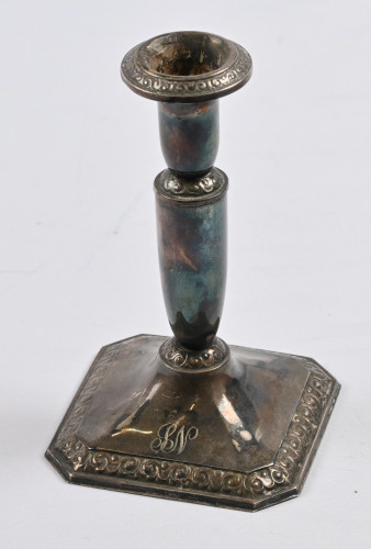 Kynttilänjalka, hopeaa (830), kaiverrus, vuosileima: R7. Korkeus noin 15 cm. Tavanomaista käyttökulumaa