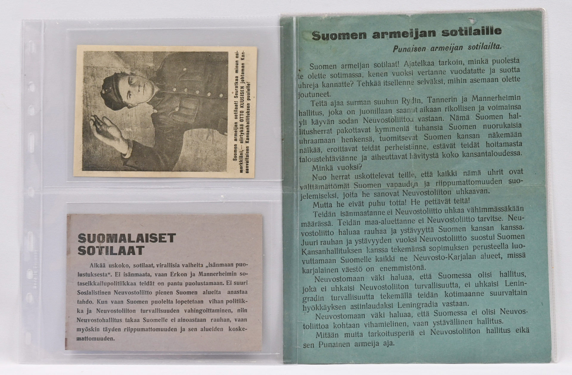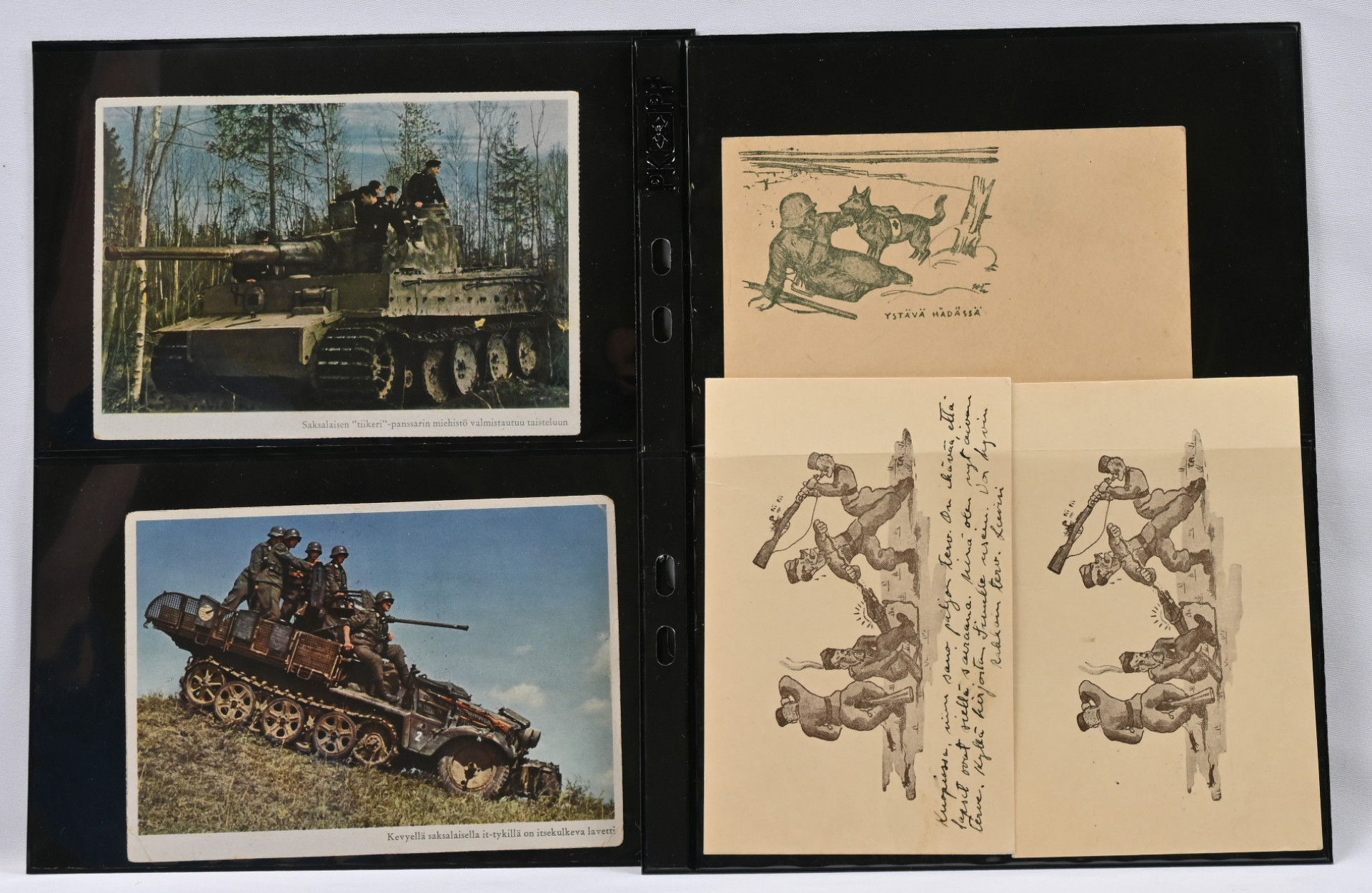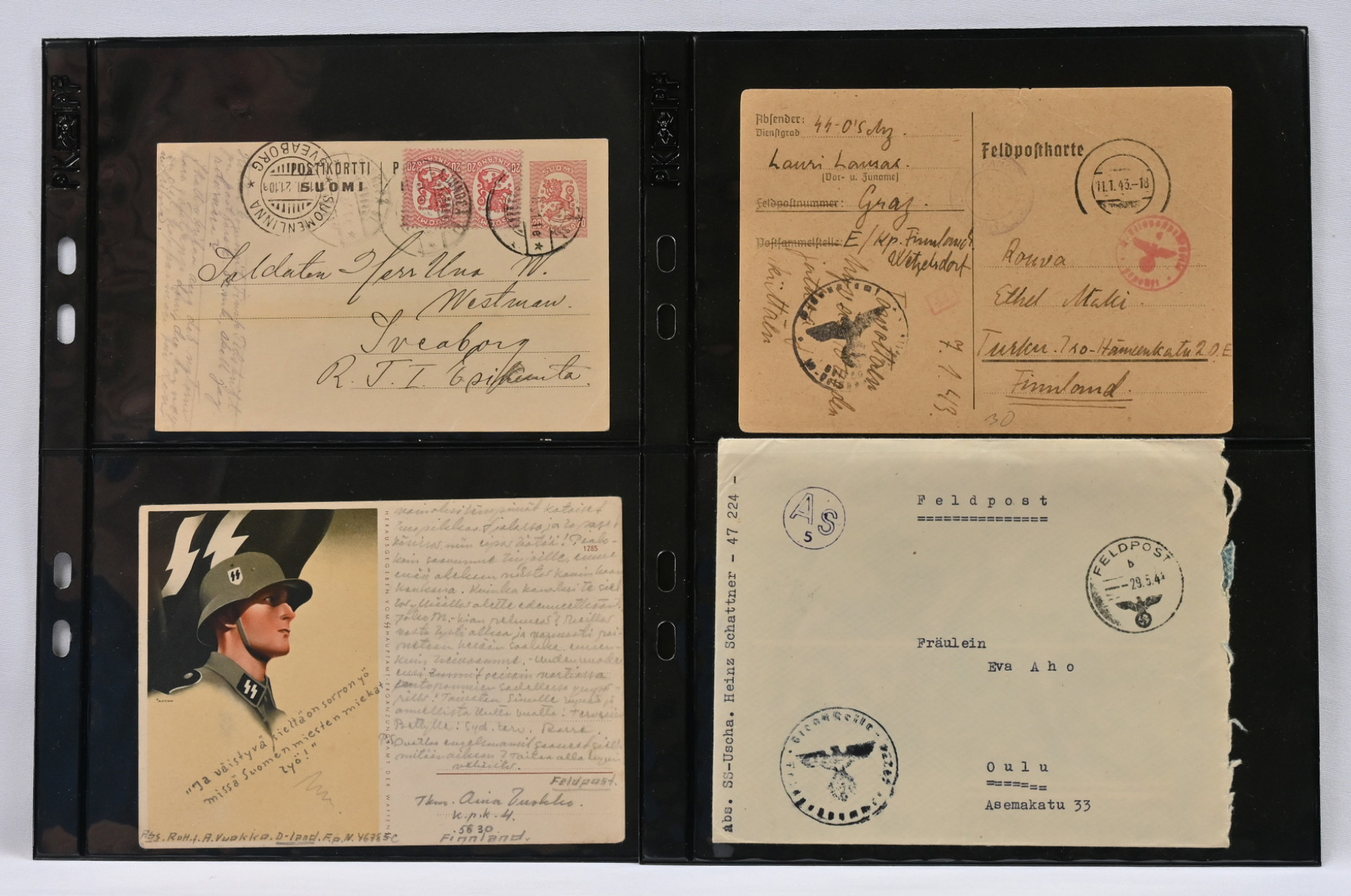Monipuolinen pieni erä kenttäpostikohteita 1918 - 1945. Sotavankipostia, kenttäpostia, lentolehtisiä, pari valokuvaa ym. Mm. yksi ss-lähetys ss-vapaaehtoistoimiston leimalla