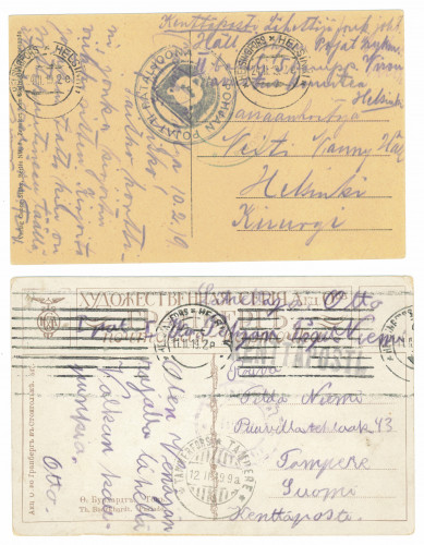 1919 Pohjan Pojat, Viron vapaaehtoisjoukoista kaksi korttia Suomeen. Toisessa Helsinki 11.II.19 ja saapumisleima Tampere 12.II.19, KENTTÄPOSTI -leima sekä Pohjan Pojat Rykmentin Esikunta-leima. Toisessa Helsinki 24.II.19 ja Pohjan Pojat II pataljoona -leima. Toisen kortin reunoissa pientä vikaa