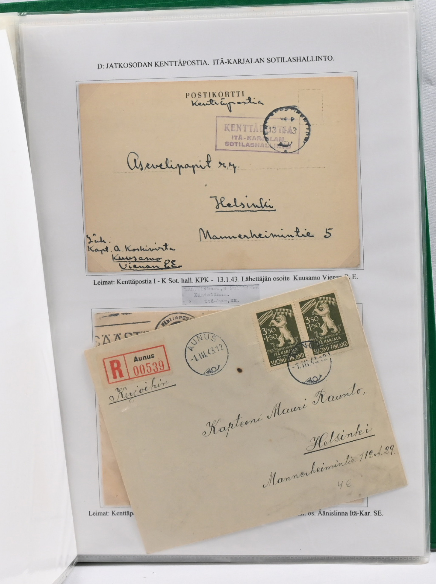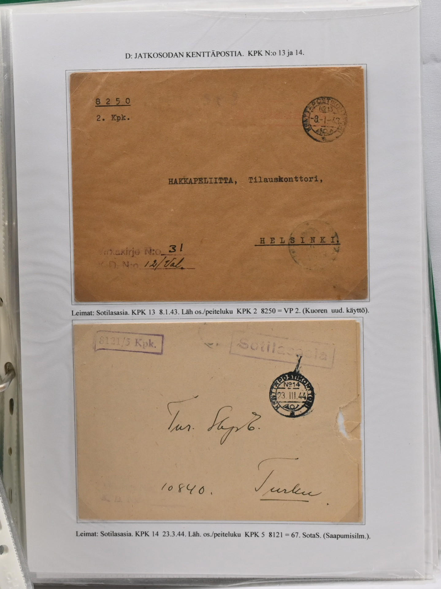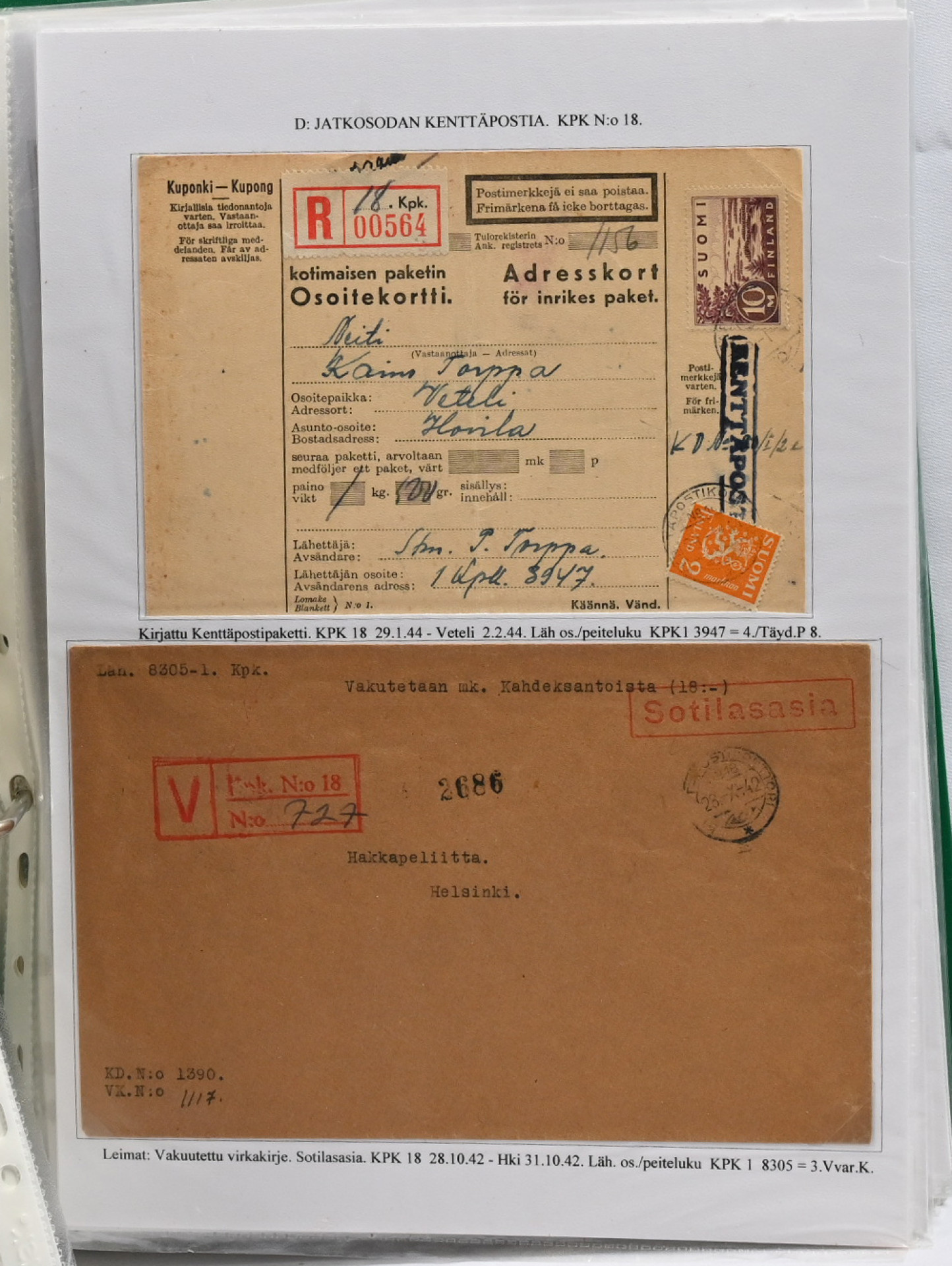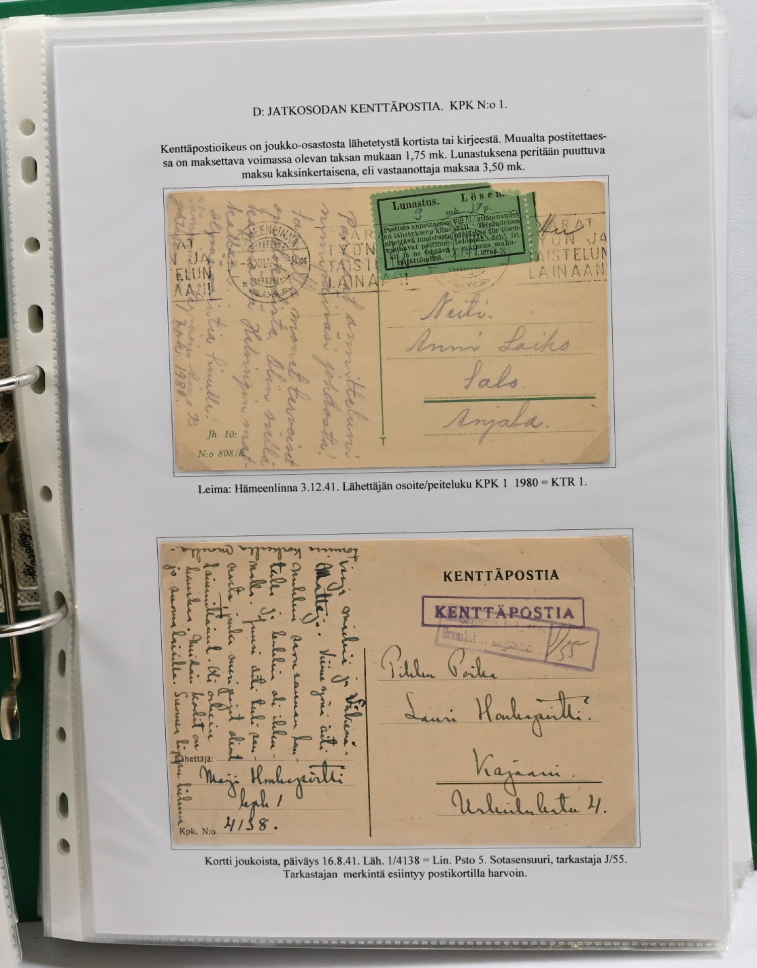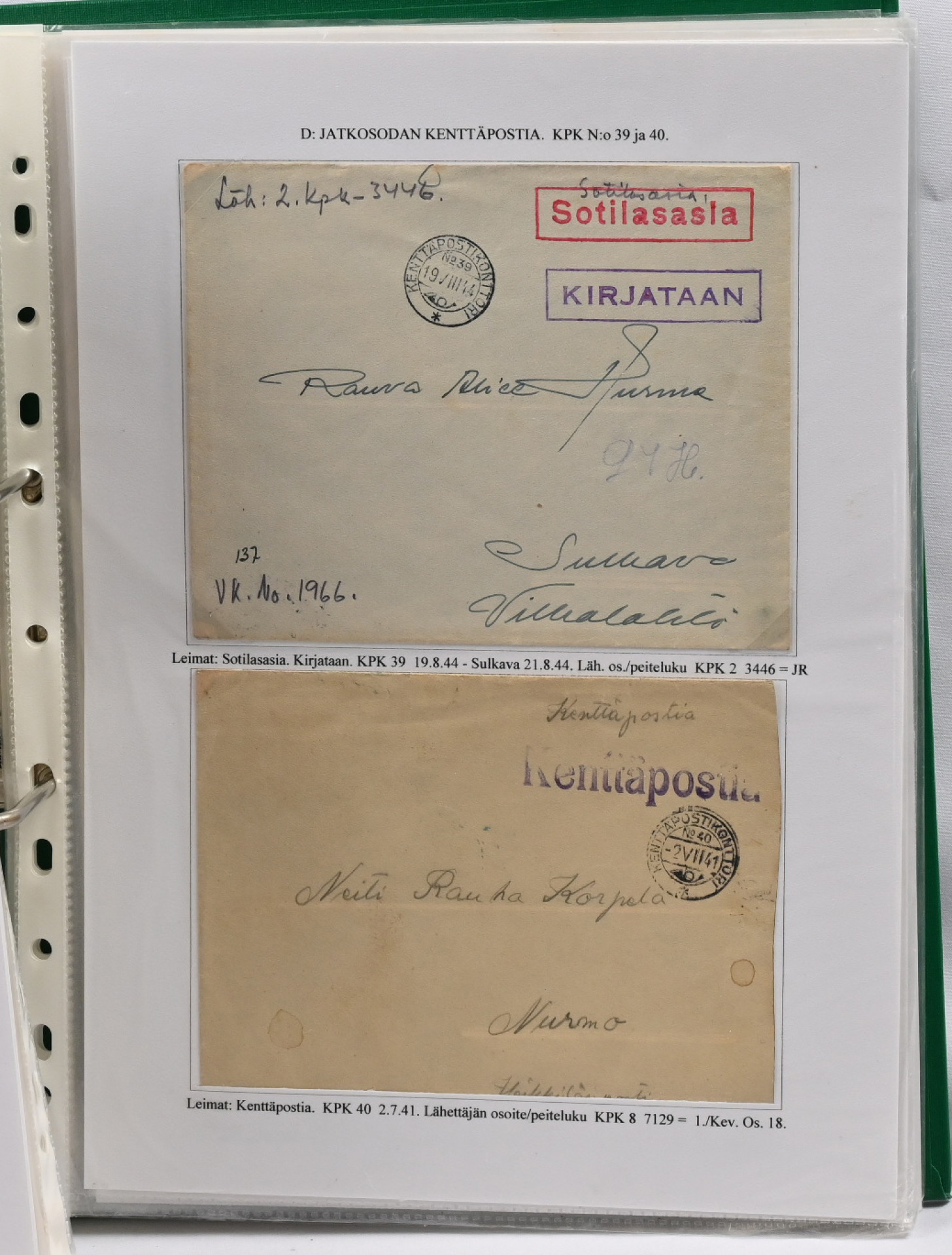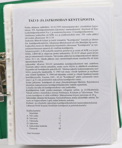 1939 – 1944 palkittu talvi- ja jatkosodan kenttäpostia käsittelevä kokoelma, laajuudeltaan 80 sivua sisältäen yli 150 kohdetta. Myydään kokonaisena alkuperäisessä kunnossa – yhtään kohdetta ei ole poistettu. Kokoelma on jäsennetty kenttäpostikonttoreittain niin, että talvisodan kustakin eri konttorista ja jatkosodan kustakin eri konttorista on esitetty postite. Mukana on otteina myös Lapin sodasta sekä Itä-Karjalan sotilashallinnon postia. Kirjeiden ja korttien lisäksi mukana on pakettikortteja, lunastuksia, kirjattua postia, Ruotsiin ja Tanskaan mennyttä postia ruotsalaisvapaaehtoisilta, yksikköleimoja, sotilasasia-lähetyksiä ym. Mukana myös talvisodan aikana Norjasta 20.12.1939 lähetetty kortti, joka on osoitettu Puolustusvoimien ylipäällikkö Mannerheimille ja hänen kauttaan ”tuntemattomille lotille”. Ainutkertainen tilaisuus hankkia kerralla vuosikymmenien keräily- ja tutkimustyön tuloksena syntynyt valmis näyttelykokoelma.
