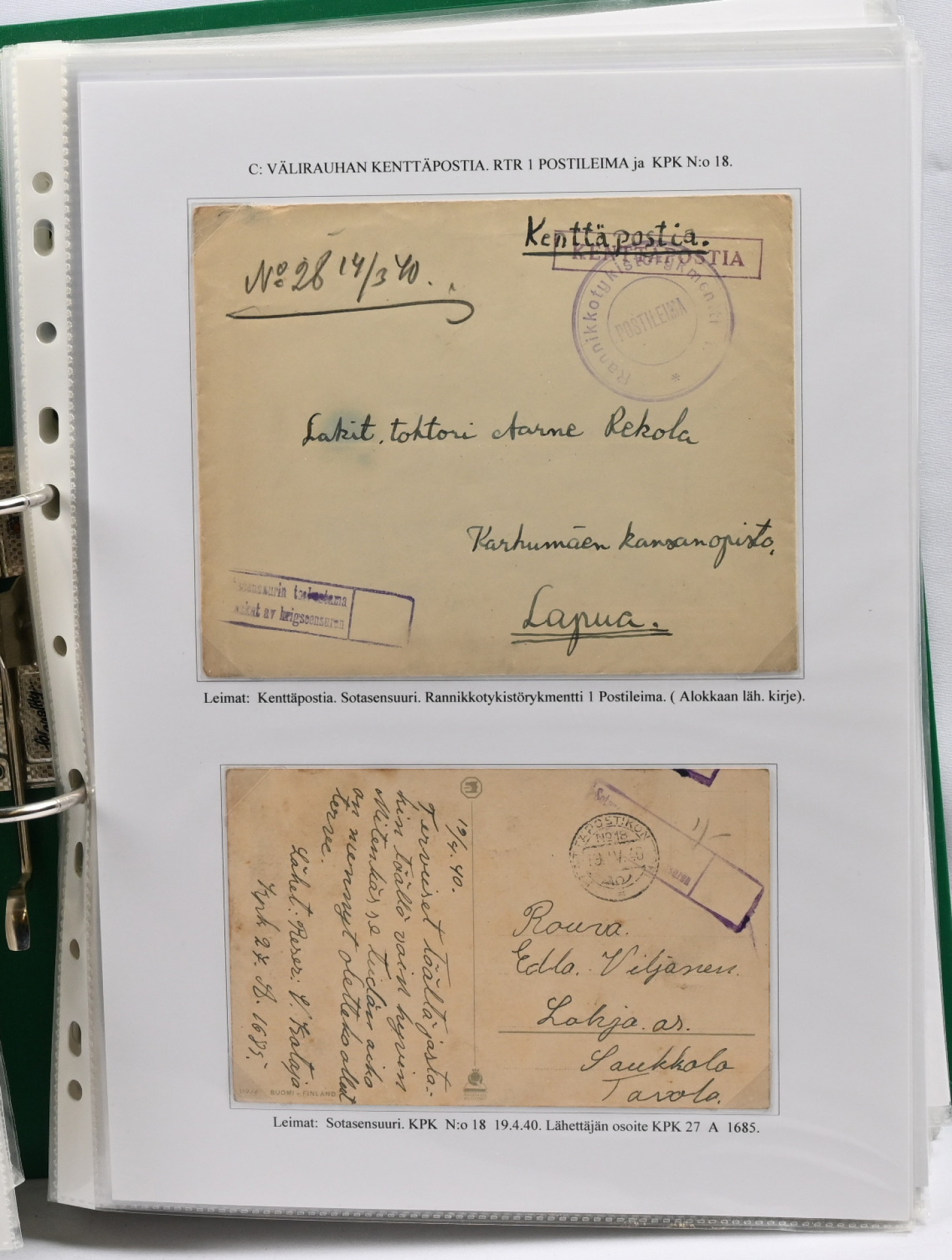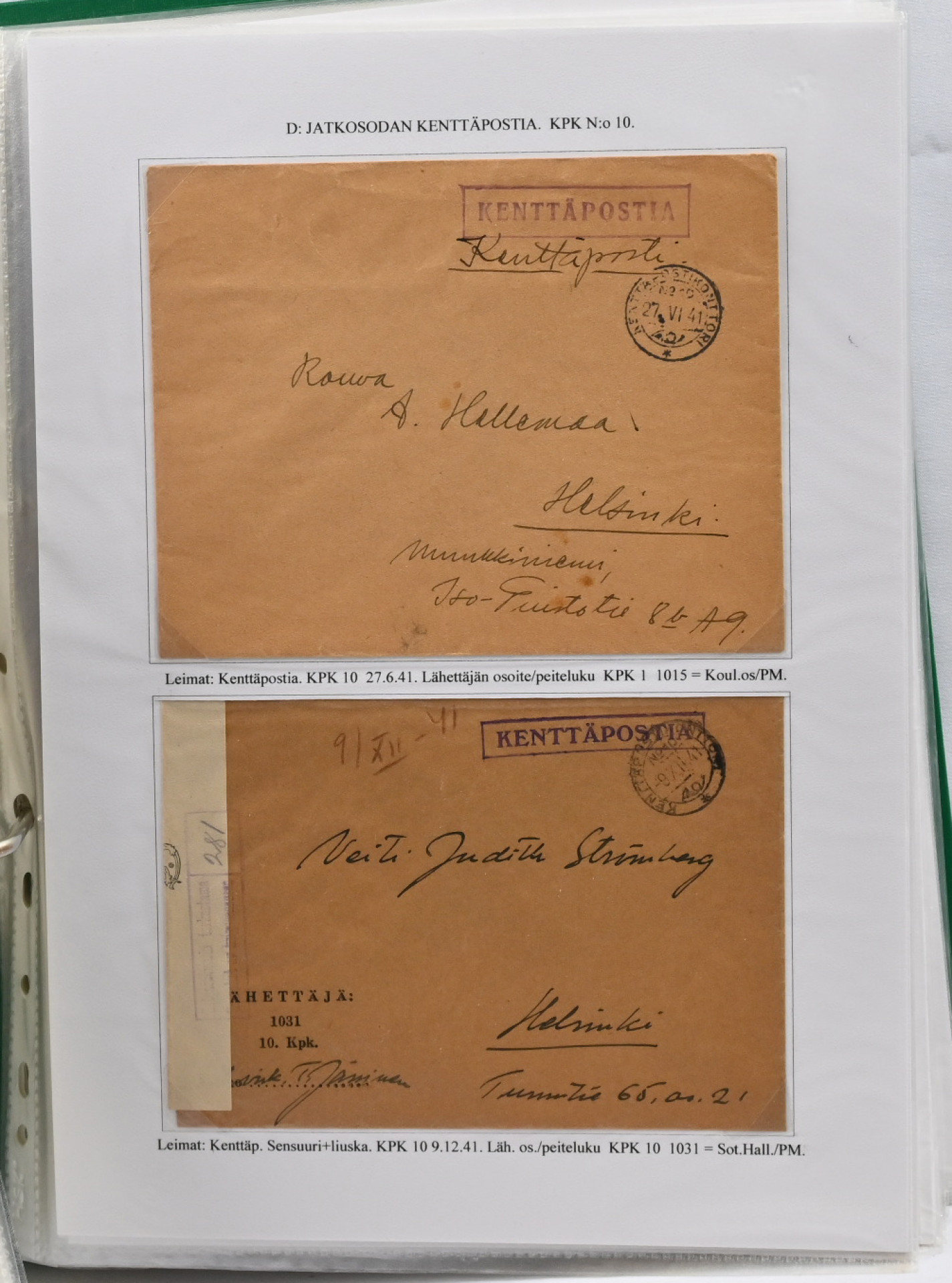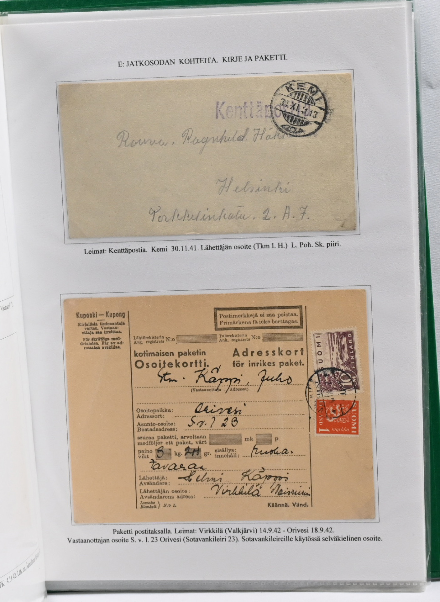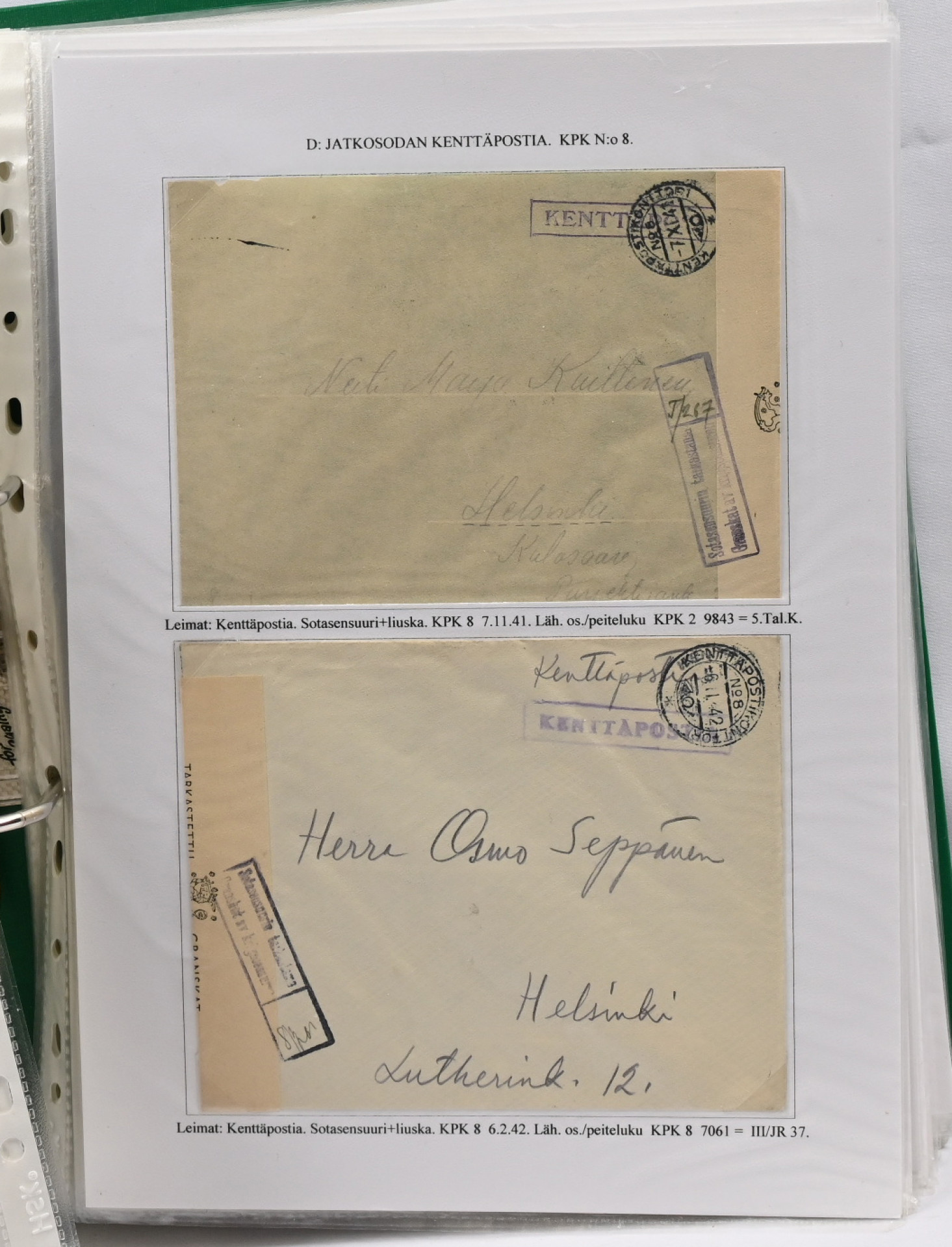 1939 – 1944 palkittu talvi- ja jatkosodan kenttäpostia käsittelevä kokoelma, laajuudeltaan 80 sivua sisältäen yli 150 kohdetta. Myydään kokonaisena alkuperäisessä kunnossa – yhtään kohdetta ei ole poistettu. Kokoelma on jäsennetty kenttäpostikonttoreittain niin, että talvisodan kustakin eri konttorista ja jatkosodan kustakin eri konttorista on esitetty postite. Mukana on otteina myös Lapin sodasta sekä Itä-Karjalan sotilashallinnon postia. Kirjeiden ja korttien lisäksi mukana on pakettikortteja, lunastuksia, kirjattua postia, Ruotsiin ja Tanskaan mennyttä postia ruotsalaisvapaaehtoisilta, yksikköleimoja, sotilasasia-lähetyksiä ym. Mukana myös talvisodan aikana Norjasta 20.12.1939 lähetetty kortti, joka on osoitettu Puolustusvoimien ylipäällikkö Mannerheimille ja hänen kauttaan ”tuntemattomille lotille”. Ainutkertainen tilaisuus hankkia kerralla vuosikymmenien keräily- ja tutkimustyön tuloksena syntynyt valmis näyttelykokoelma.