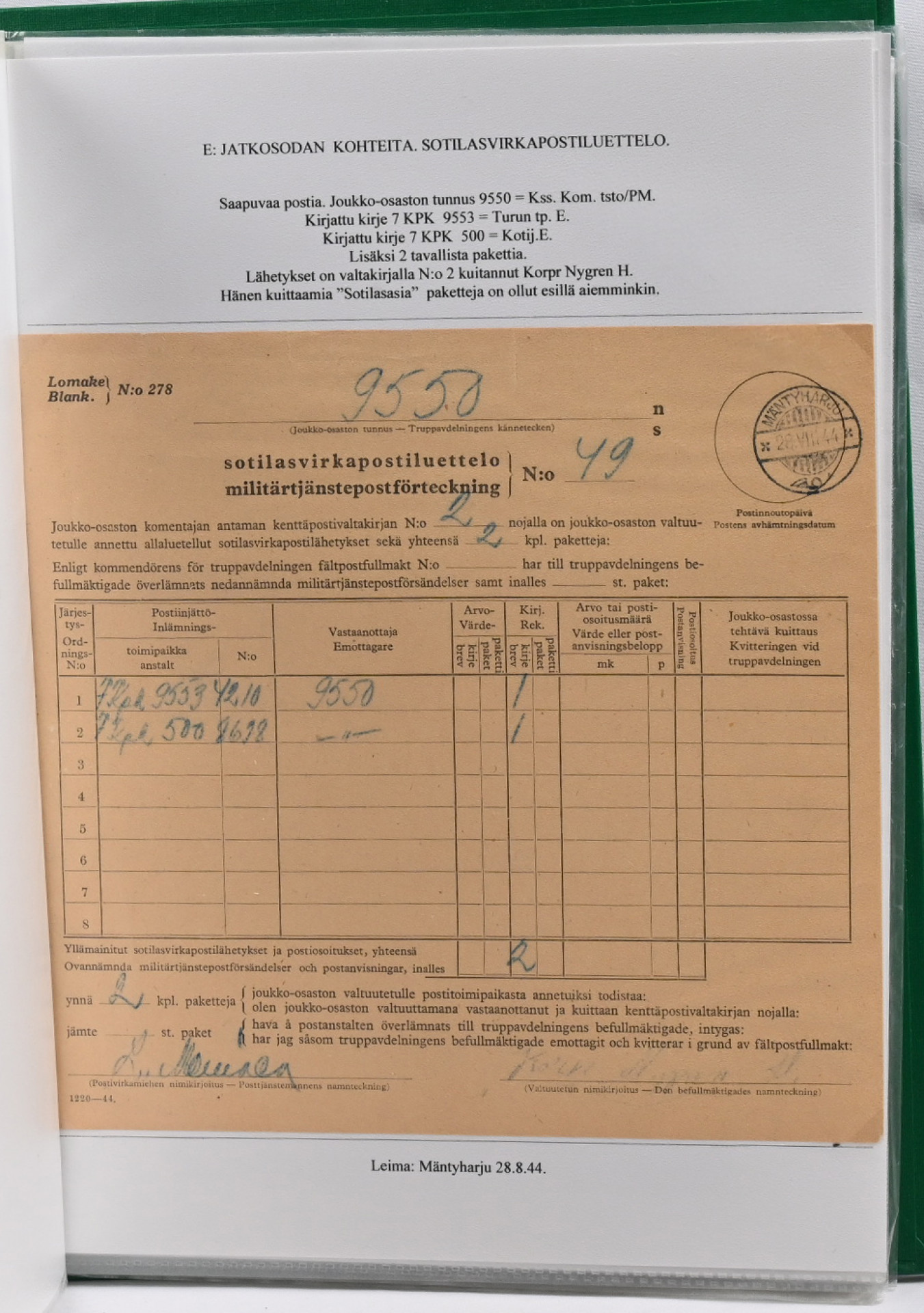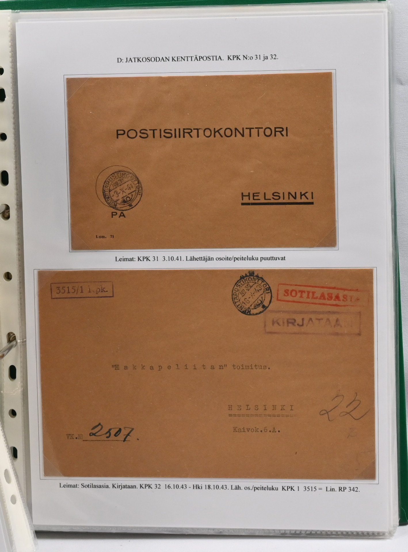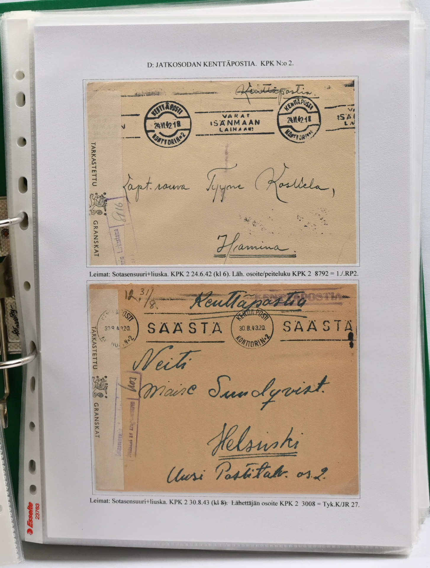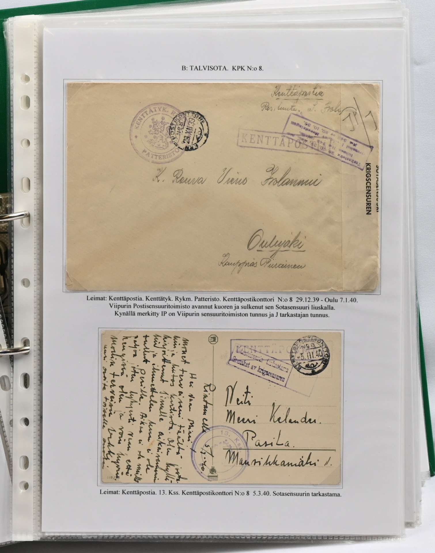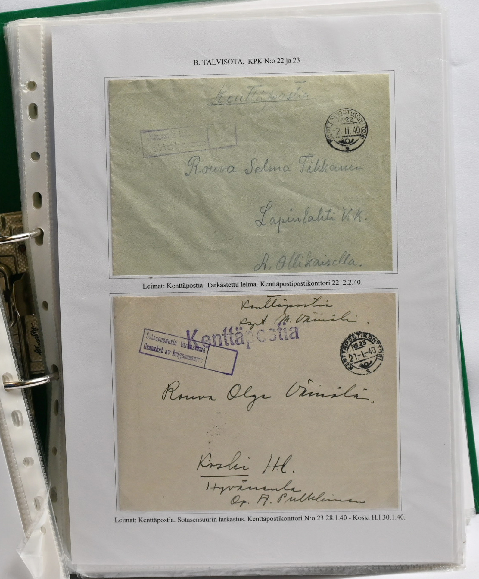 1939 – 1944 palkittu talvi- ja jatkosodan kenttäpostia käsittelevä kokoelma, laajuudeltaan 80 sivua sisältäen yli 150 kohdetta. Myydään kokonaisena alkuperäisessä kunnossa – yhtään kohdetta ei ole poistettu. Kokoelma on jäsennetty kenttäpostikonttoreittain niin, että talvisodan kustakin eri konttorista ja jatkosodan kustakin eri konttorista on esitetty postite. Mukana on otteina myös Lapin sodasta sekä Itä-Karjalan sotilashallinnon postia. Kirjeiden ja korttien lisäksi mukana on pakettikortteja, lunastuksia, kirjattua postia, Ruotsiin ja Tanskaan mennyttä postia ruotsalaisvapaaehtoisilta, yksikköleimoja, sotilasasia-lähetyksiä ym. Mukana myös talvisodan aikana Norjasta 20.12.1939 lähetetty kortti, joka on osoitettu Puolustusvoimien ylipäällikkö Mannerheimille ja hänen kauttaan ”tuntemattomille lotille”. Ainutkertainen tilaisuus hankkia kerralla vuosikymmenien keräily- ja tutkimustyön tuloksena syntynyt valmis näyttelykokoelma.
