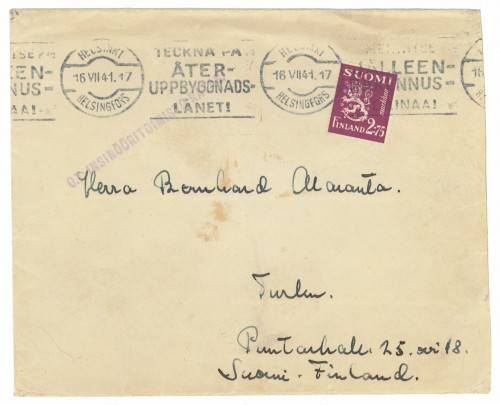 SS -vapaaehtoispostia: kirje tullut nyrkkipostissa Suomeen ja lähetetty Helsingistä 16.7.1941 Turkuun, Oy Insinööritoimisto Ratas -leima. Lähettäjä koulutusajan osoite Wien B