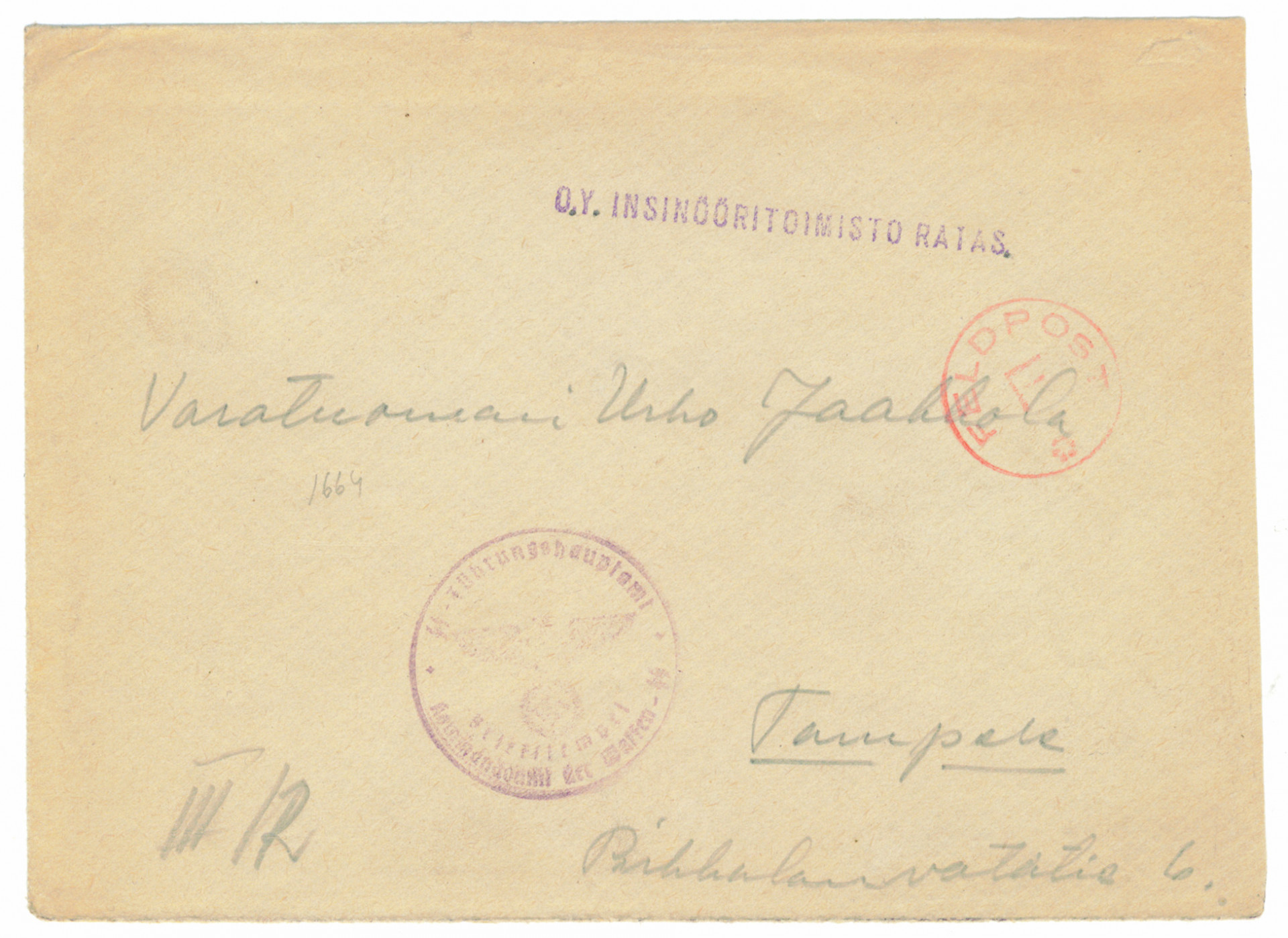 SS -vapaaehtoispostia: Oy Insinööritoimisto Ratas -leima kirjeellä Saksasta Suomeen, takana leveä Wehrmachtin sulkijaliuska