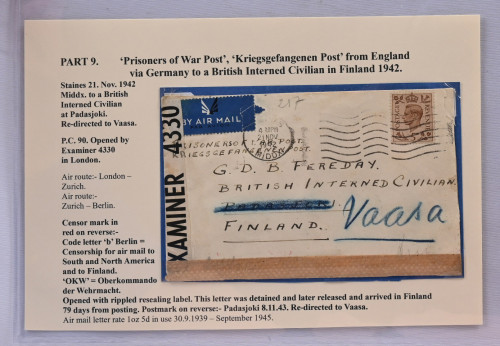 1942 sotavankipostia. Englannista Suomeen internoidulle 21.11.1942 lähetetty kirje Vaasaan, mistä edelleen Padasjoelle. Englannin ja Saksan sensuurit. Hieno ja harvinainen!