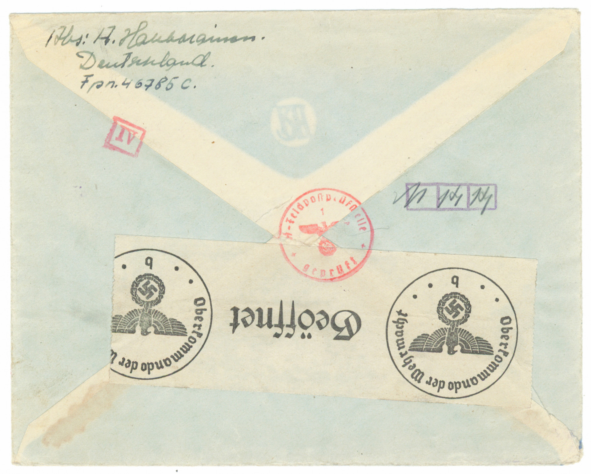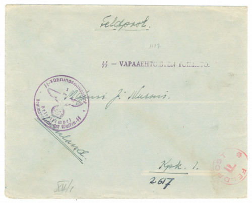 SS -vapaaehtoispostia: Feldpost -kirje Suomeen yksikköön KPK 1, SS vapaaehtoiseten toimisto -leima ym
