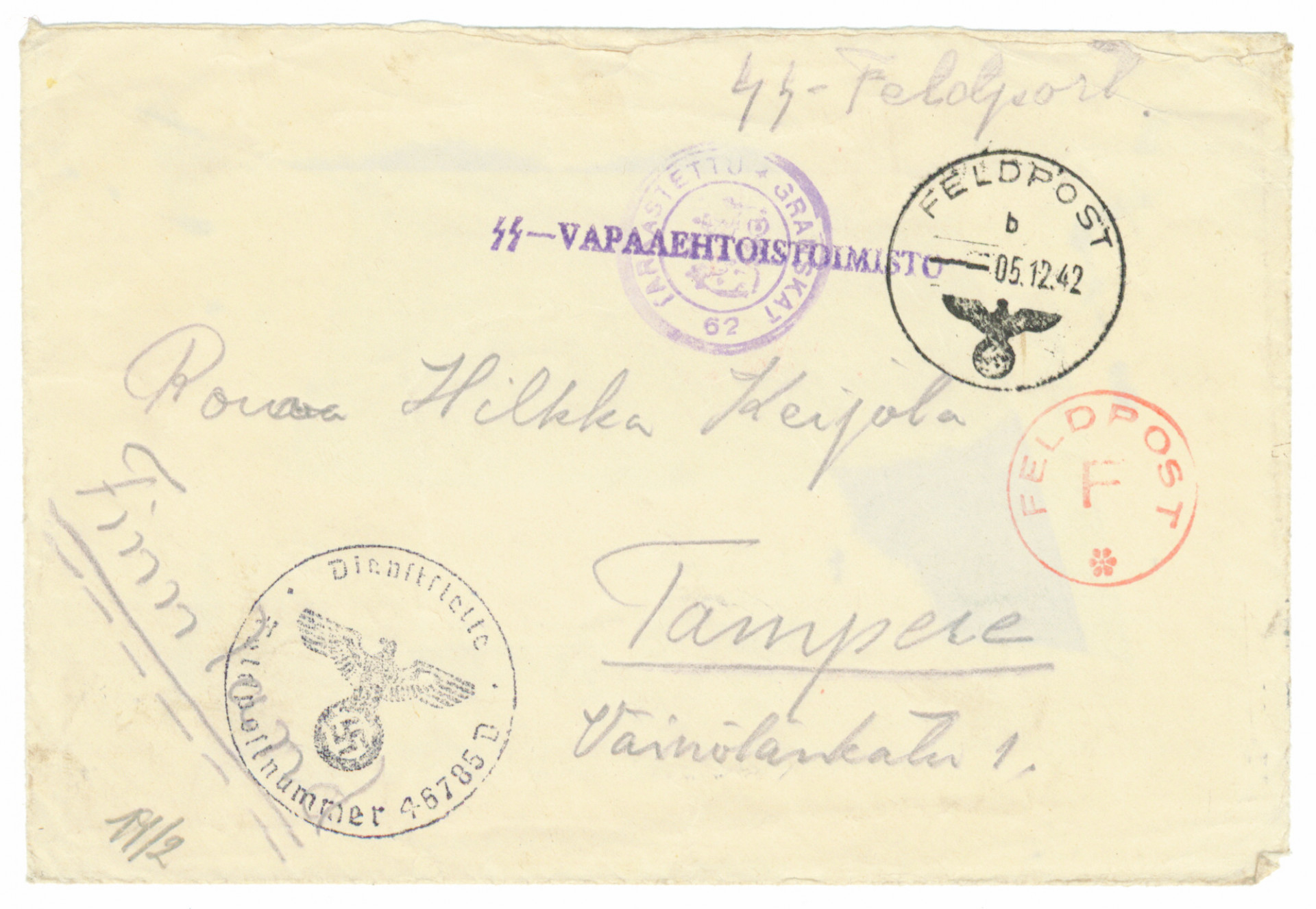 SS -vapaaehtoispostia: kirje Kaukasukselta 5.12.1942 Suomeen, SS -vapaaehtoistoimisto ym leimoja, lähettäjän peiteluku 46785D