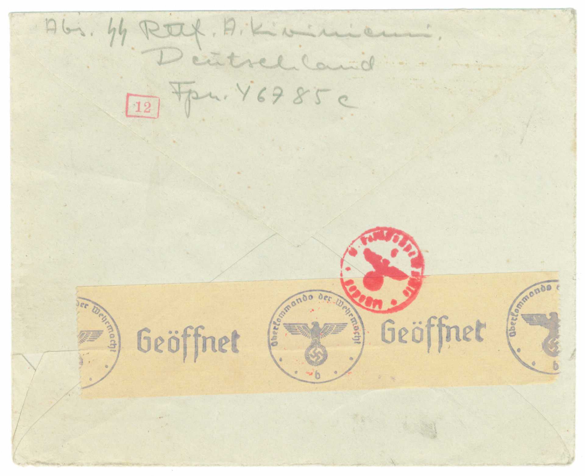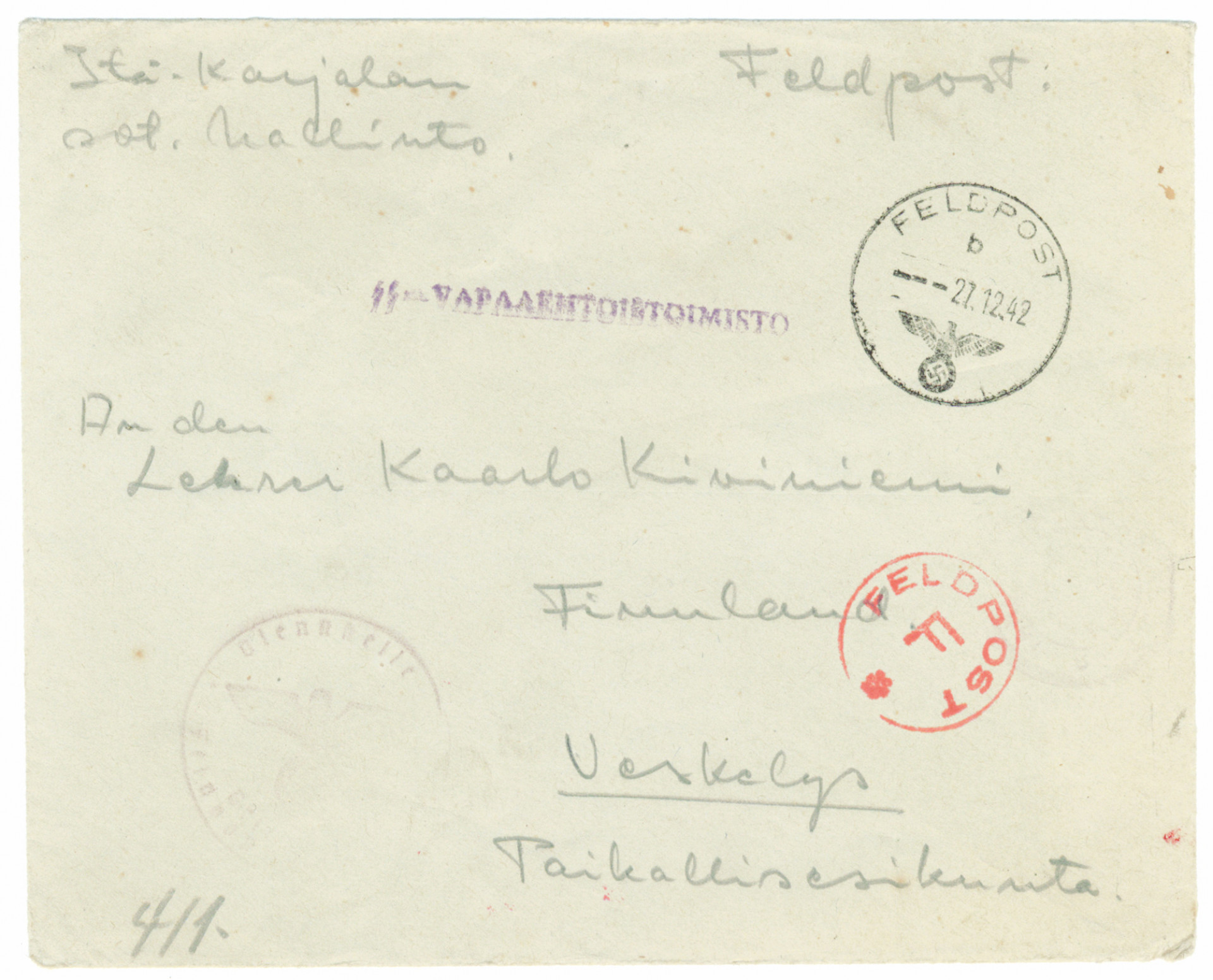 SS -vapaaehtoispostia: kirje Suomeen 27.12.1942 osoitettu Itä-Karjalan Paikallisesikuntaan Veskelykseen, SS -vapaaehtoistoimisto ym leimoja