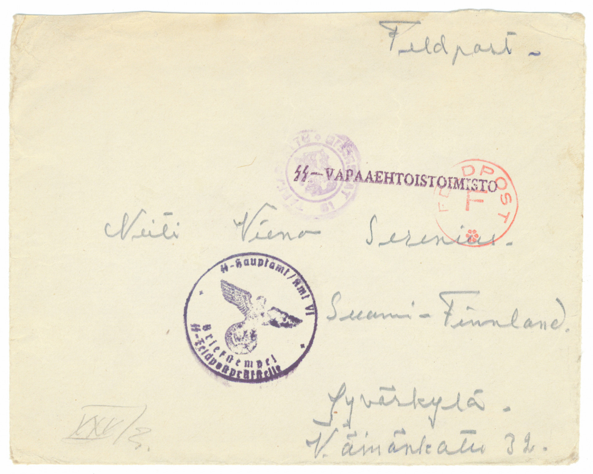 SS -vapaaehtoispostia: kirje Suomeen Divisioonan mieheltä, lähetyspaikka täydennyspataljoona Graz. SS -vapaaehtoistoimisto ym leimoja