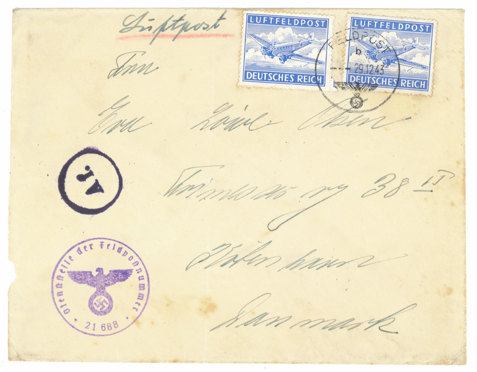 Tanskalaisen vapaaehtoisen saksalainen lentokenttäpostikirje Tanskaan 29.12.1943 Lapista. Feldpost 21688 (10. Kompanie NSKK-Kraftwagen-Transport-Regiment 10 (Todt) Ajan patinaa