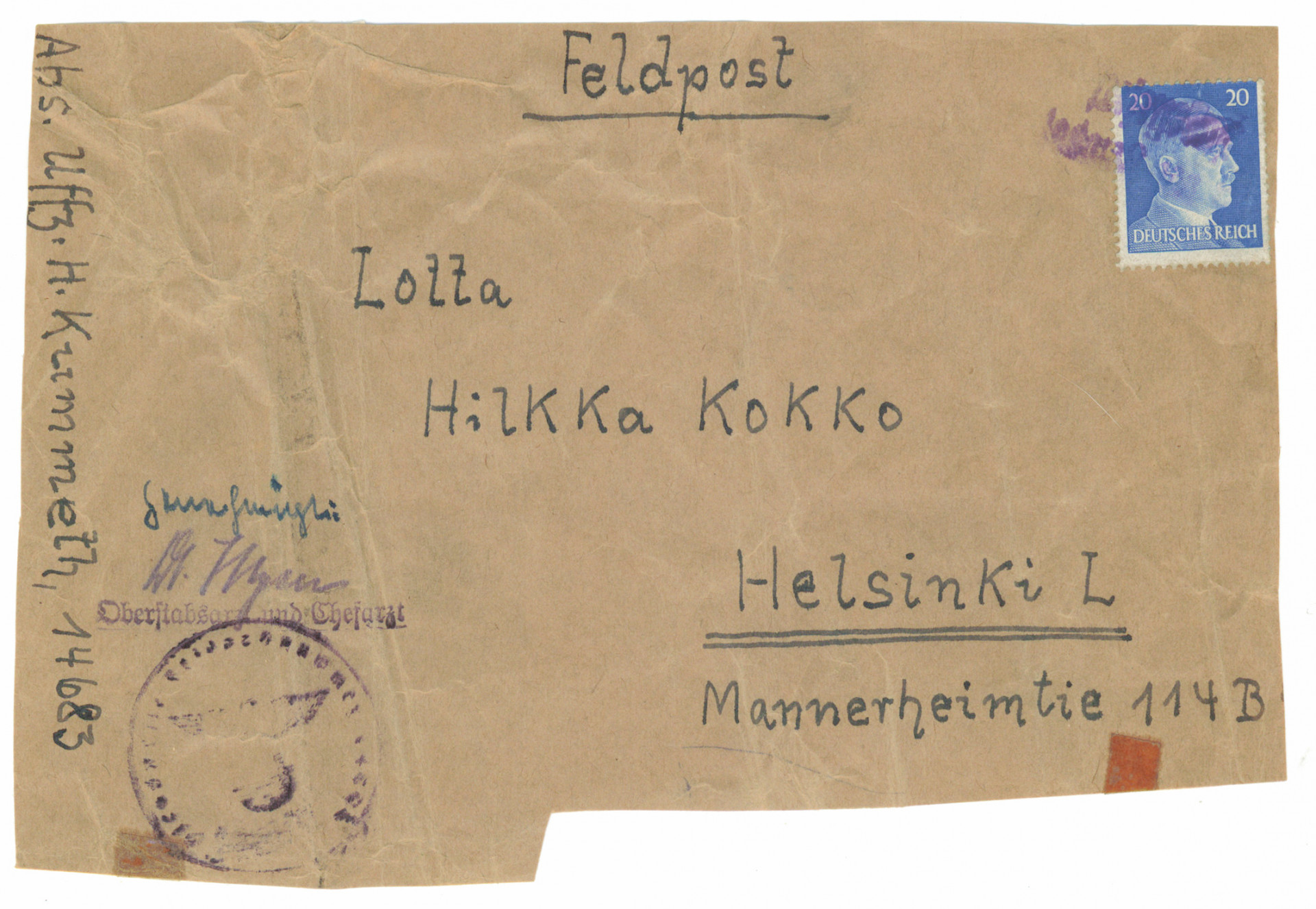 Feldpost pakettileike Saksasta 20 Rpf merkillä suomalaiselle lotalle Helsinkiin! Tavanomaista taittumaa, lähettäjä yksiköstä: 14683 - Feldlazarett 618 (toimi 1944 Lapissa Sallan Alakurtissa Verman rintamalla)