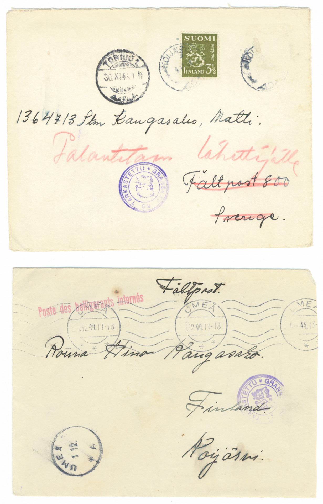 Lapin sodassa haavoittunut internoituna sairaalahoidossa Ruotsissa: kaksi lähetystä 30.11.1944 joka palautettu ja 1.12.1944 Umeå -leimalla Suomeen