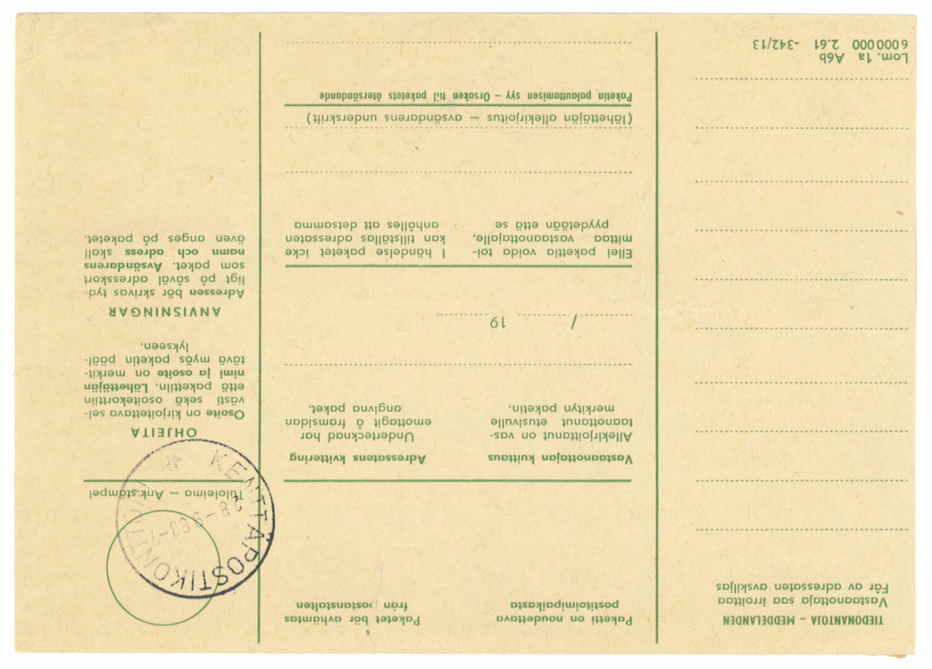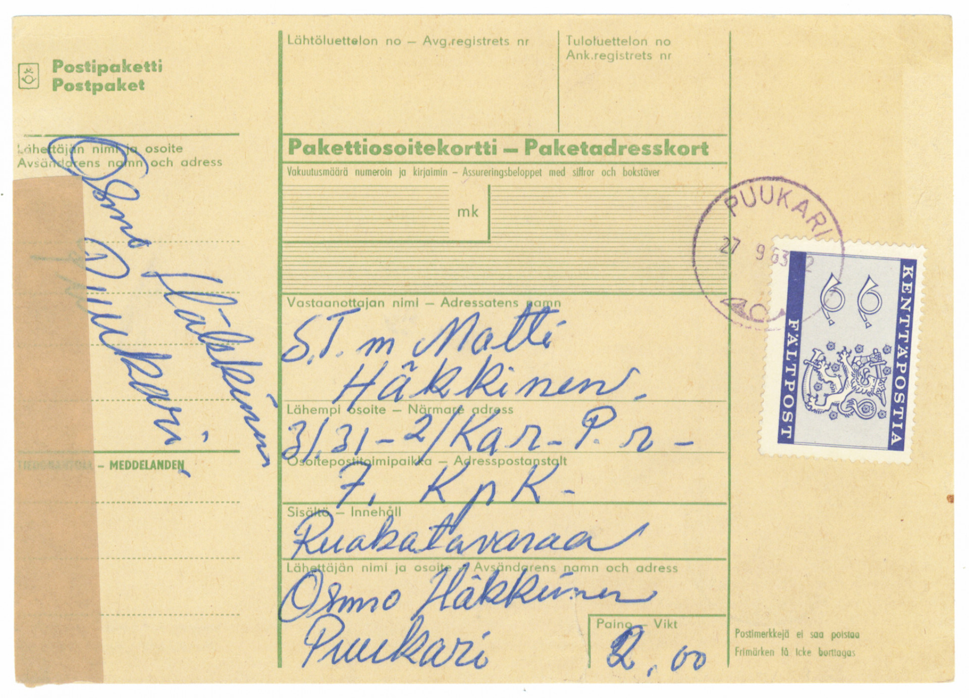 1963 Kenttäpostimerkki osoitekortilla joukkoihin, kaunis Puukari 1963