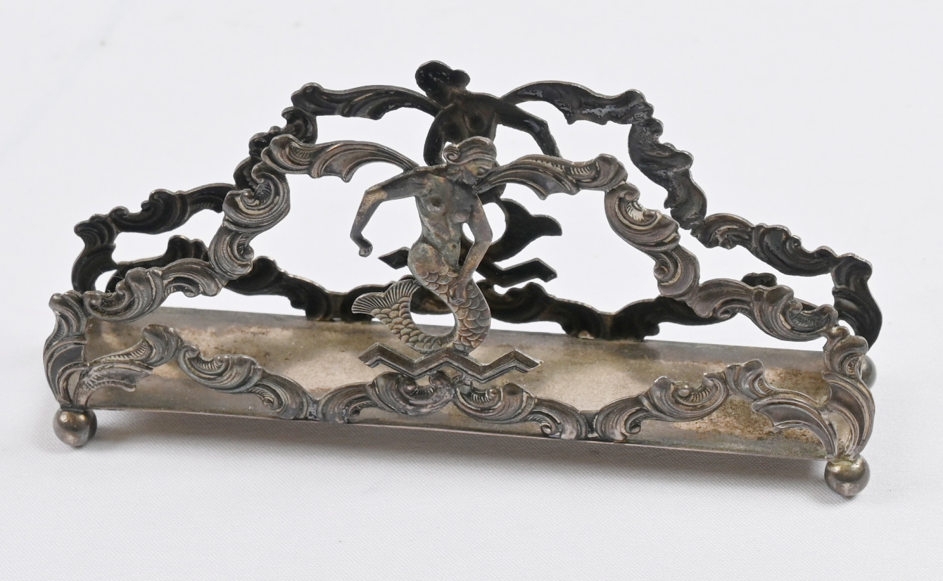 Lautasliinateline, hopeaa (813), merenneito -aihe, vuosileima C6. Korkeus noin 5 cm. Tavanomaista käyttökulumaa