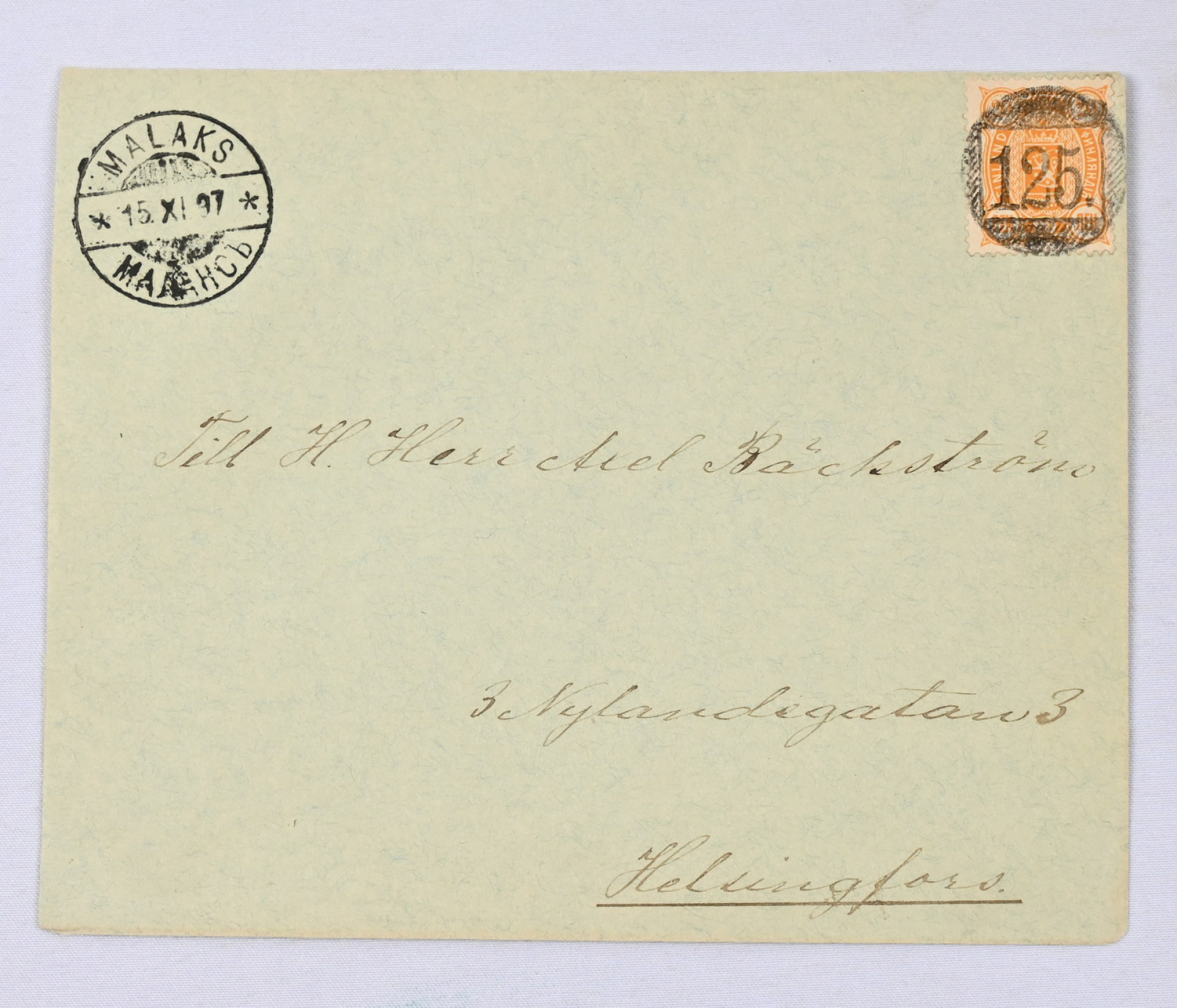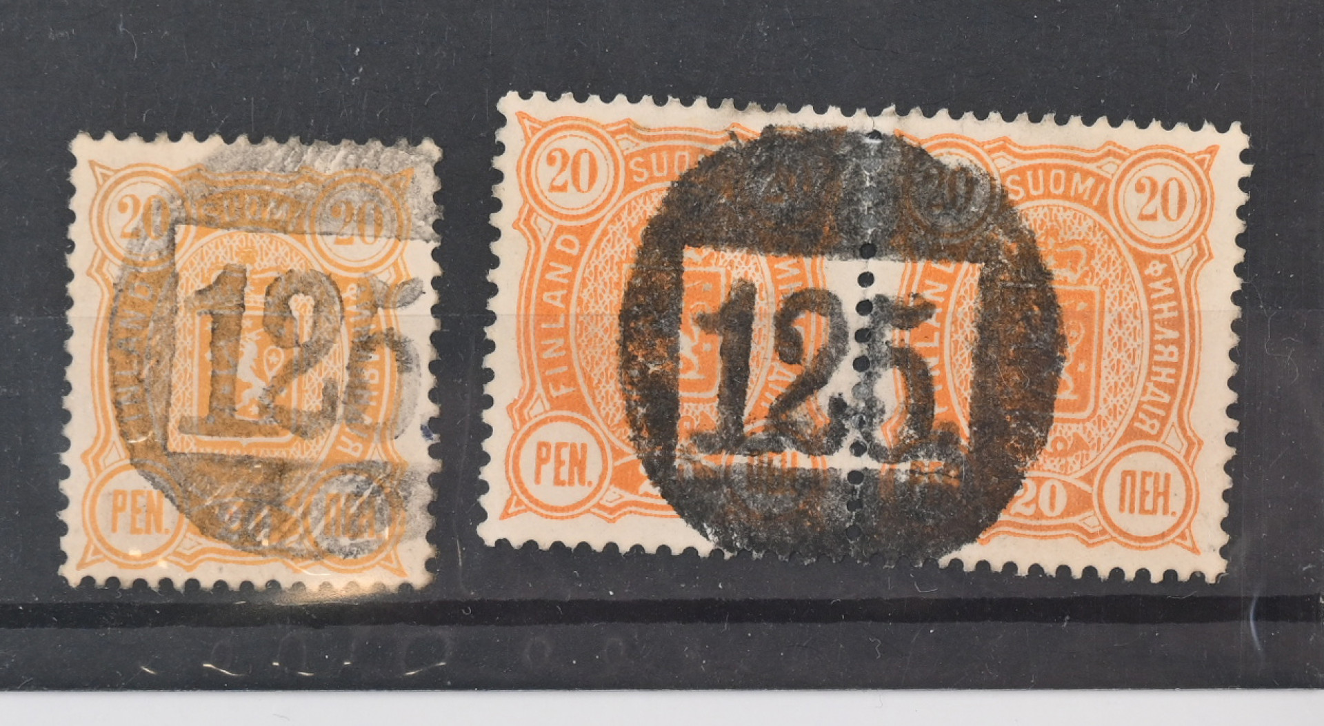 Nro 125 (R5) ja Malaks 1897 m/89 20 penniä kuorella, upea! Lisäksi kaksi merkki kohdetta