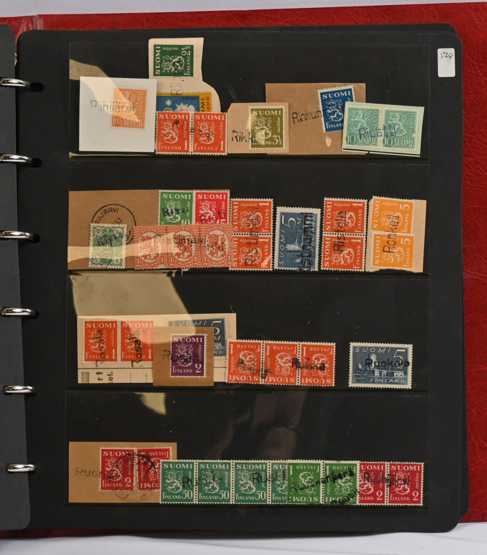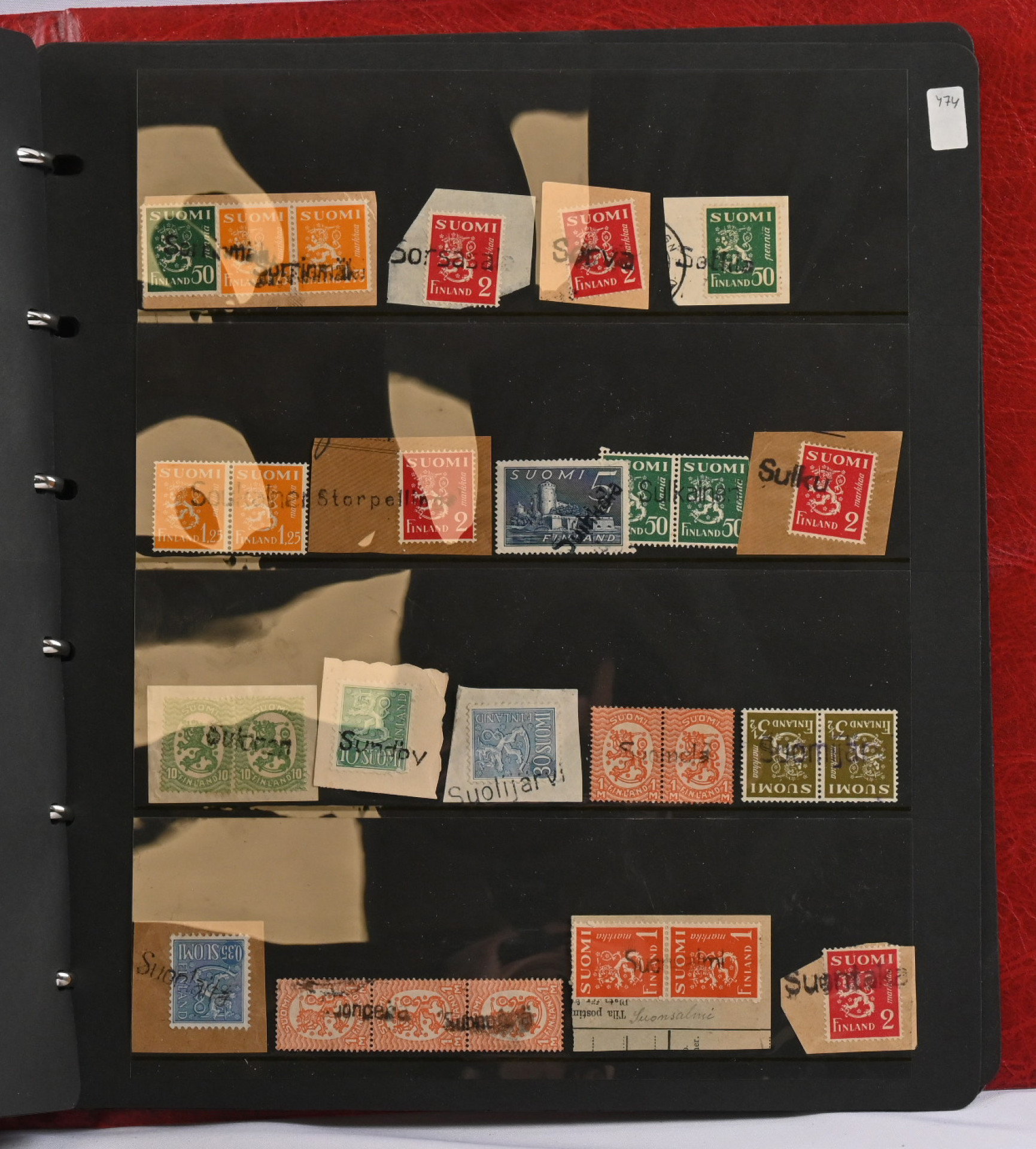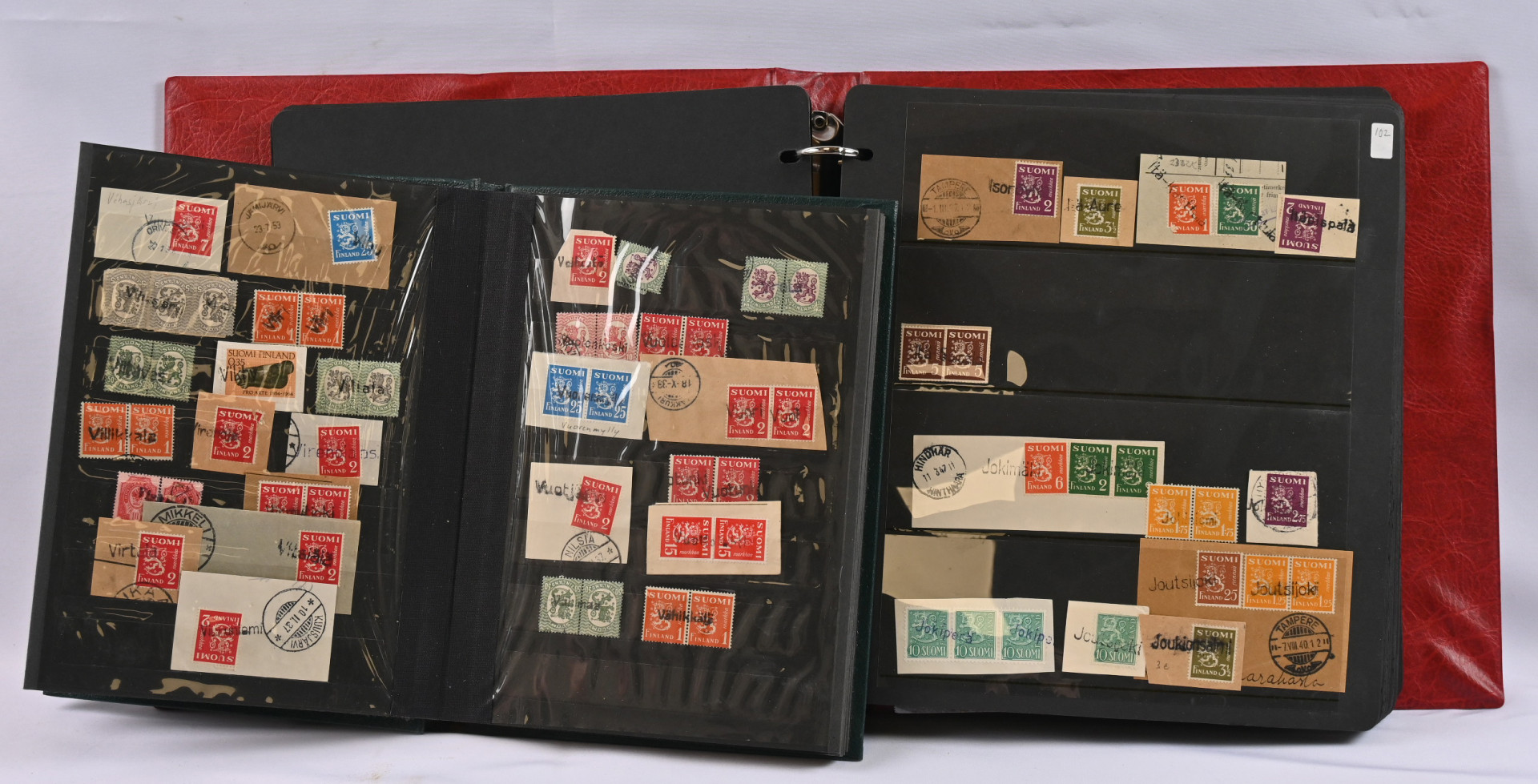 Postipysäkkileimoja leikkeillä iso erä kahdessa säiliökirjassa merkeillä ja leikkeillä. Vanhaa ja uudempaa, yli 850 kappaletta, ilmeisesti kaikki erilaisia.