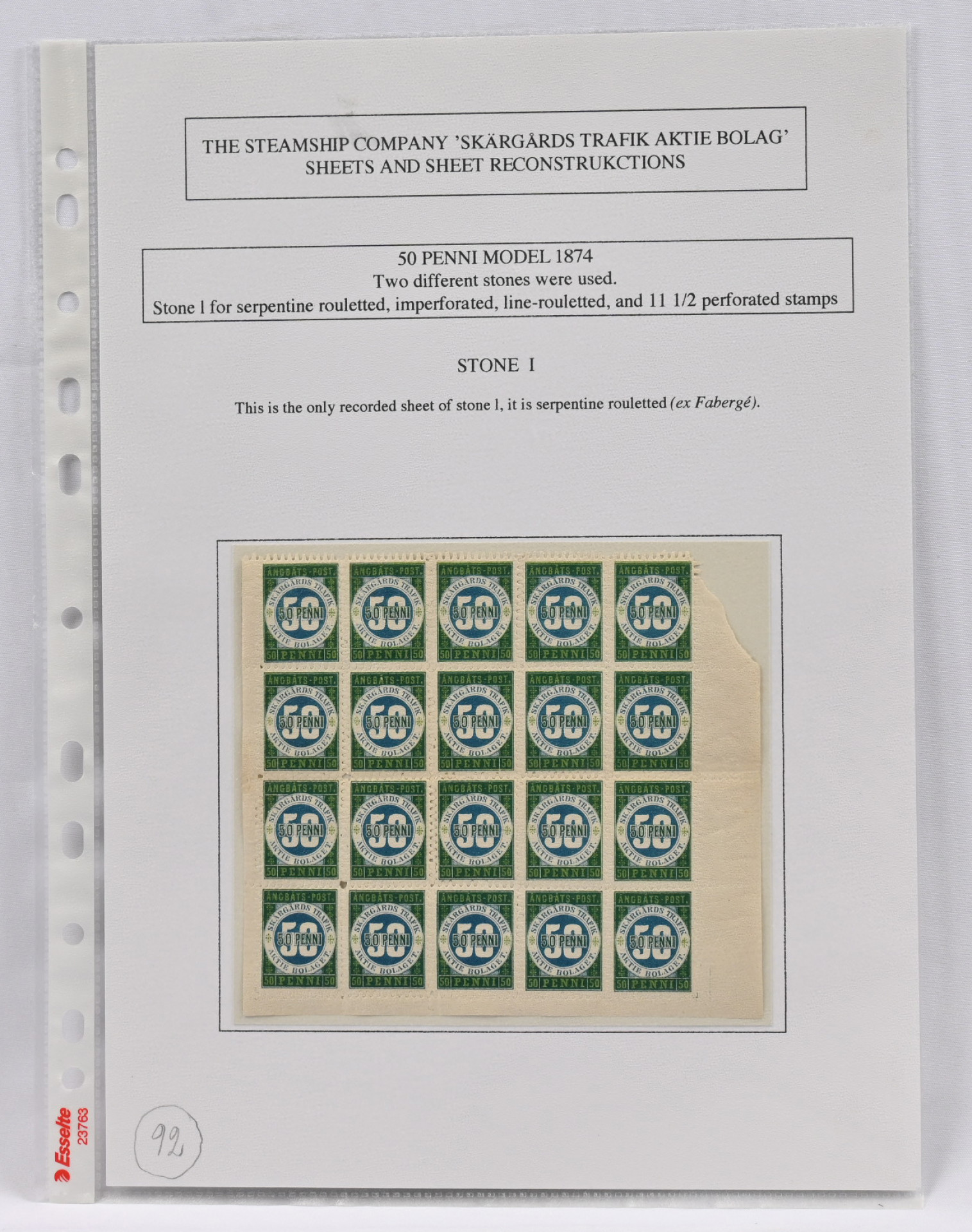 Skärgårds Trafik Aktiebolaget 1874 50 penniä harvinainen KOKONAINEN ARKKI - ilmeisesti ainoa tunnettu tästä painoksesta! Ex Fabergé, Ex Sundman (L. 78E)
