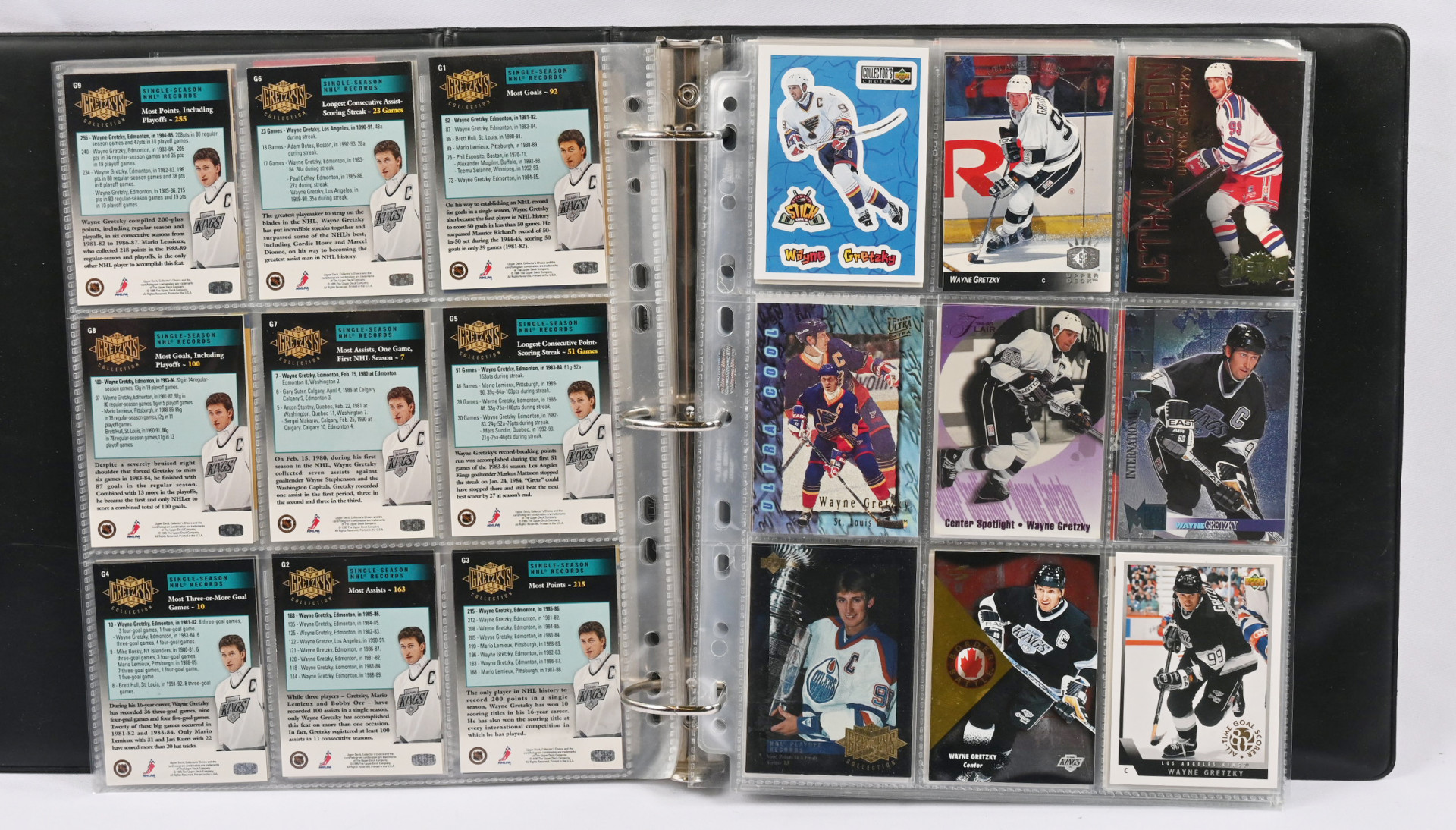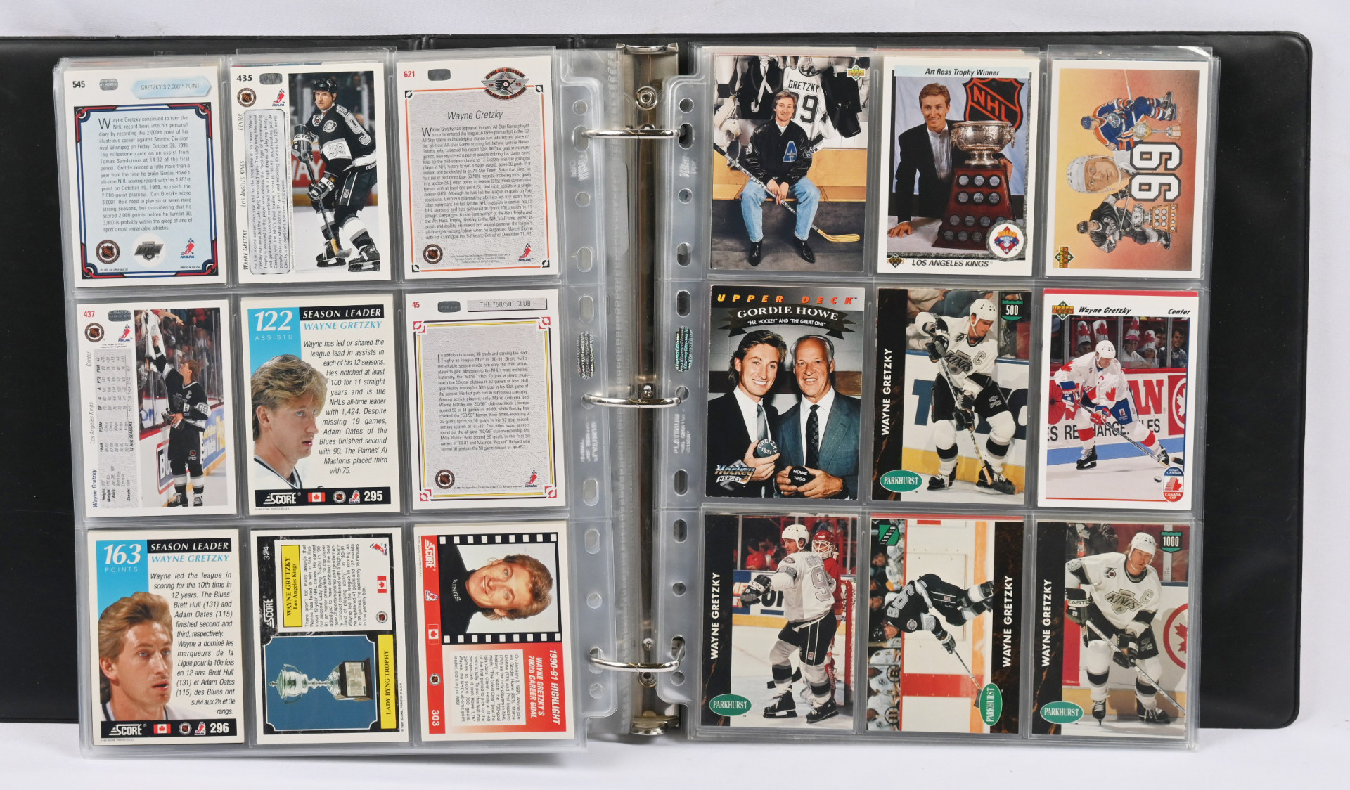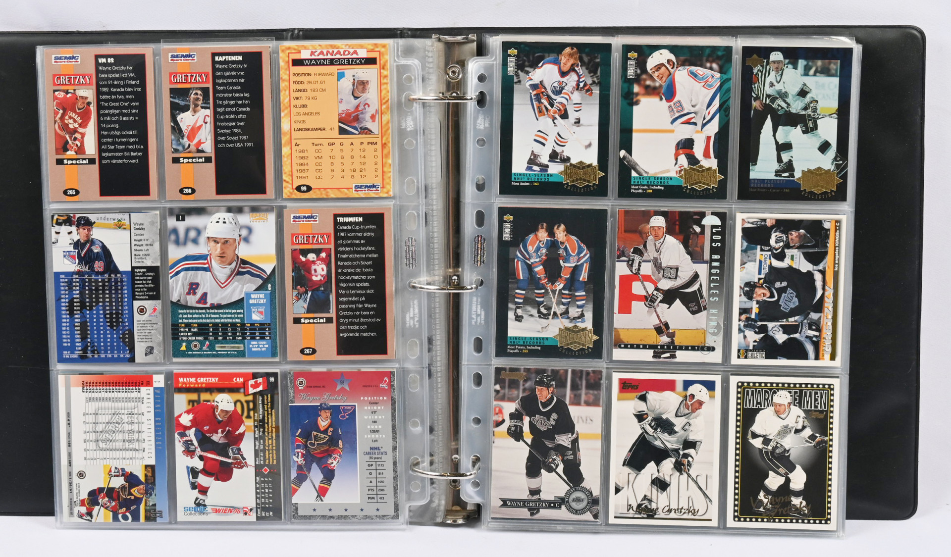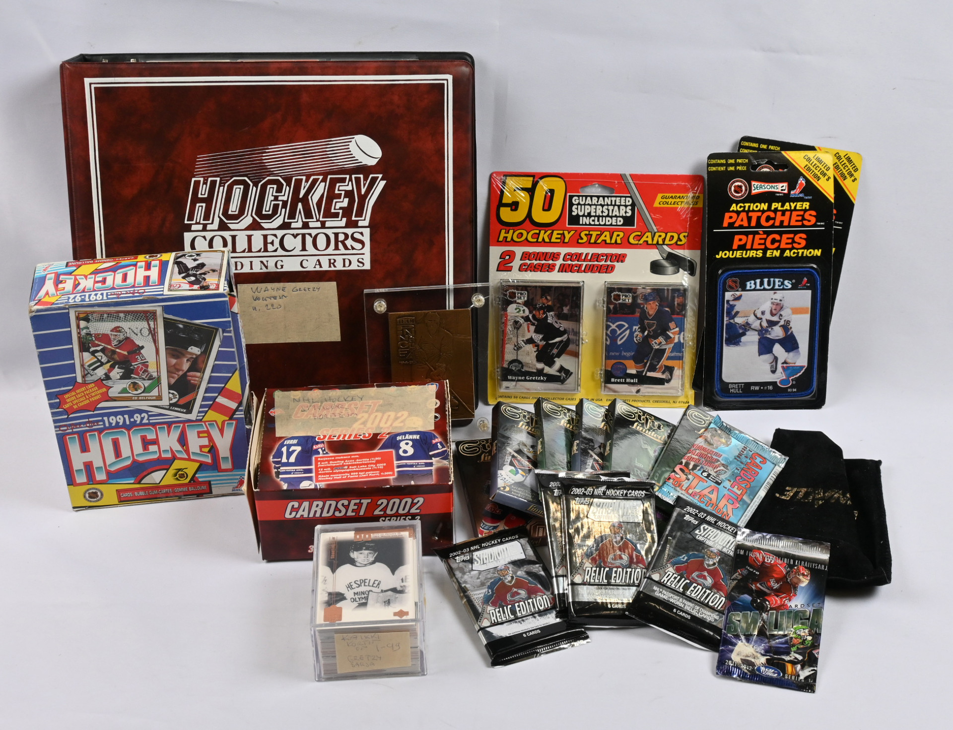Sekalainen materiaali laatikossa: Gretzky kortteja kansiossa n. 220 kappaletta, P-Pee-Chee 1991-92 avaamattomia pusseja laatikossa sekä muutamia muiden sarjojen avaamattomia pusseja, tarrakortteja ym.
