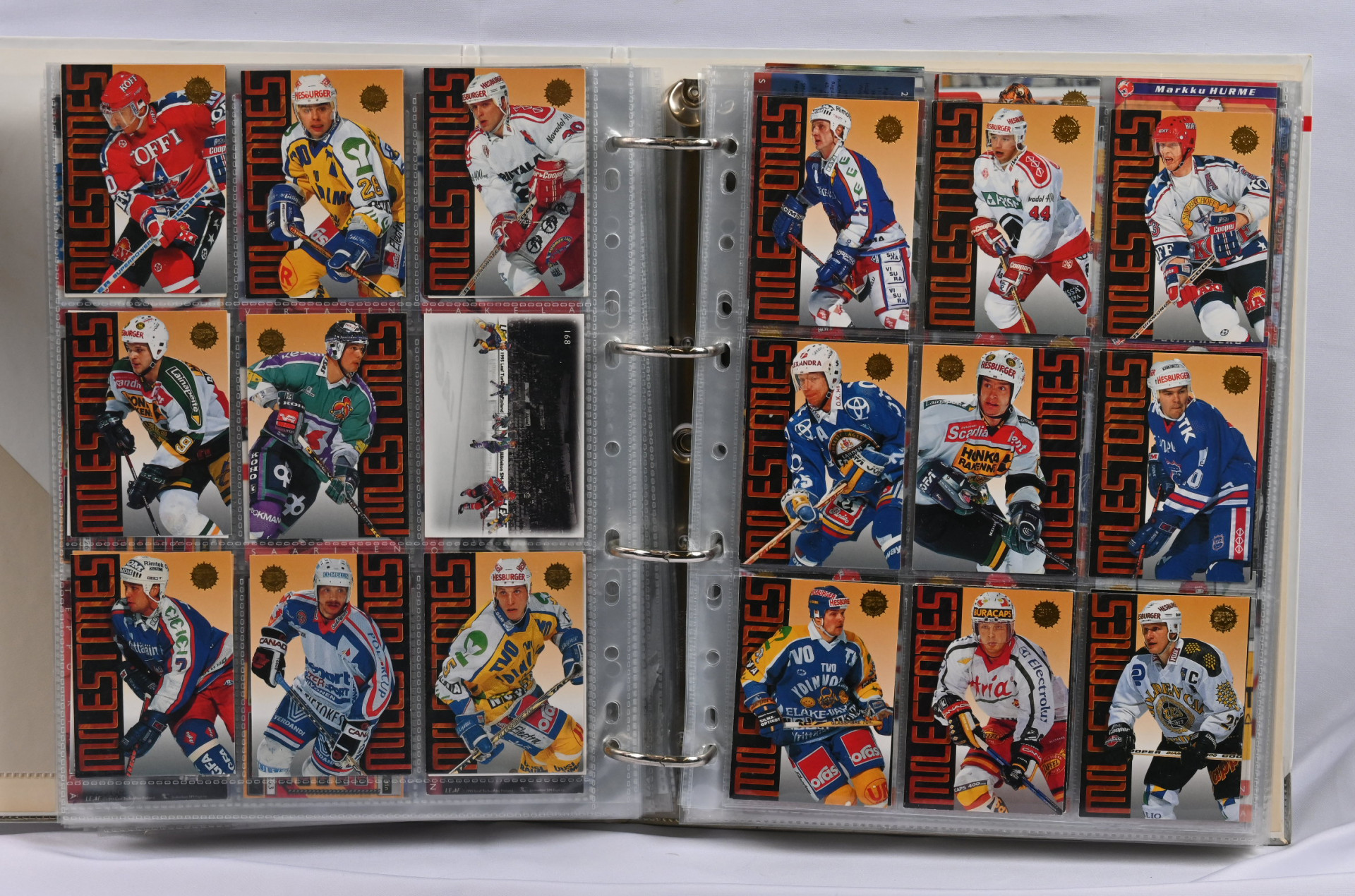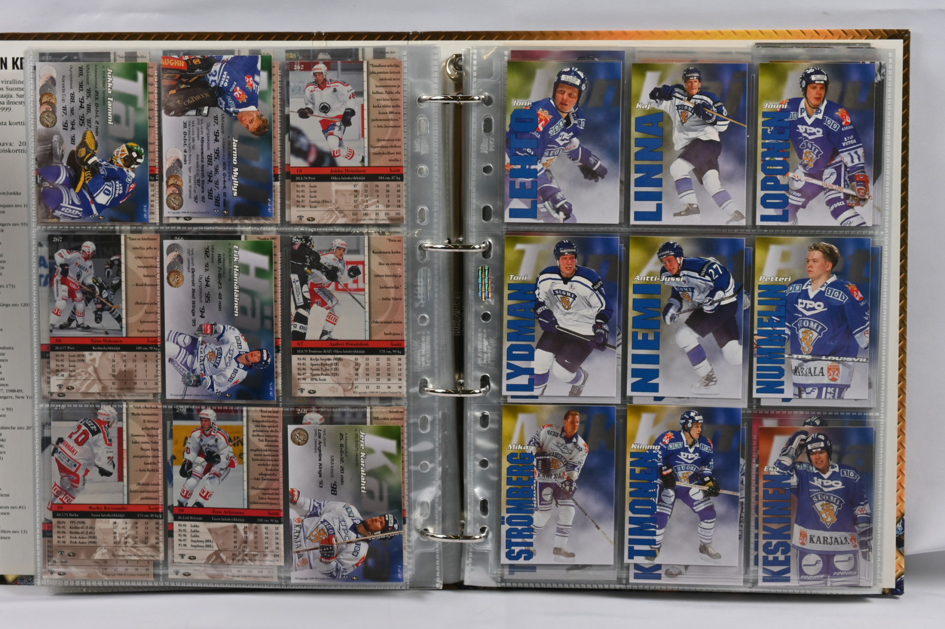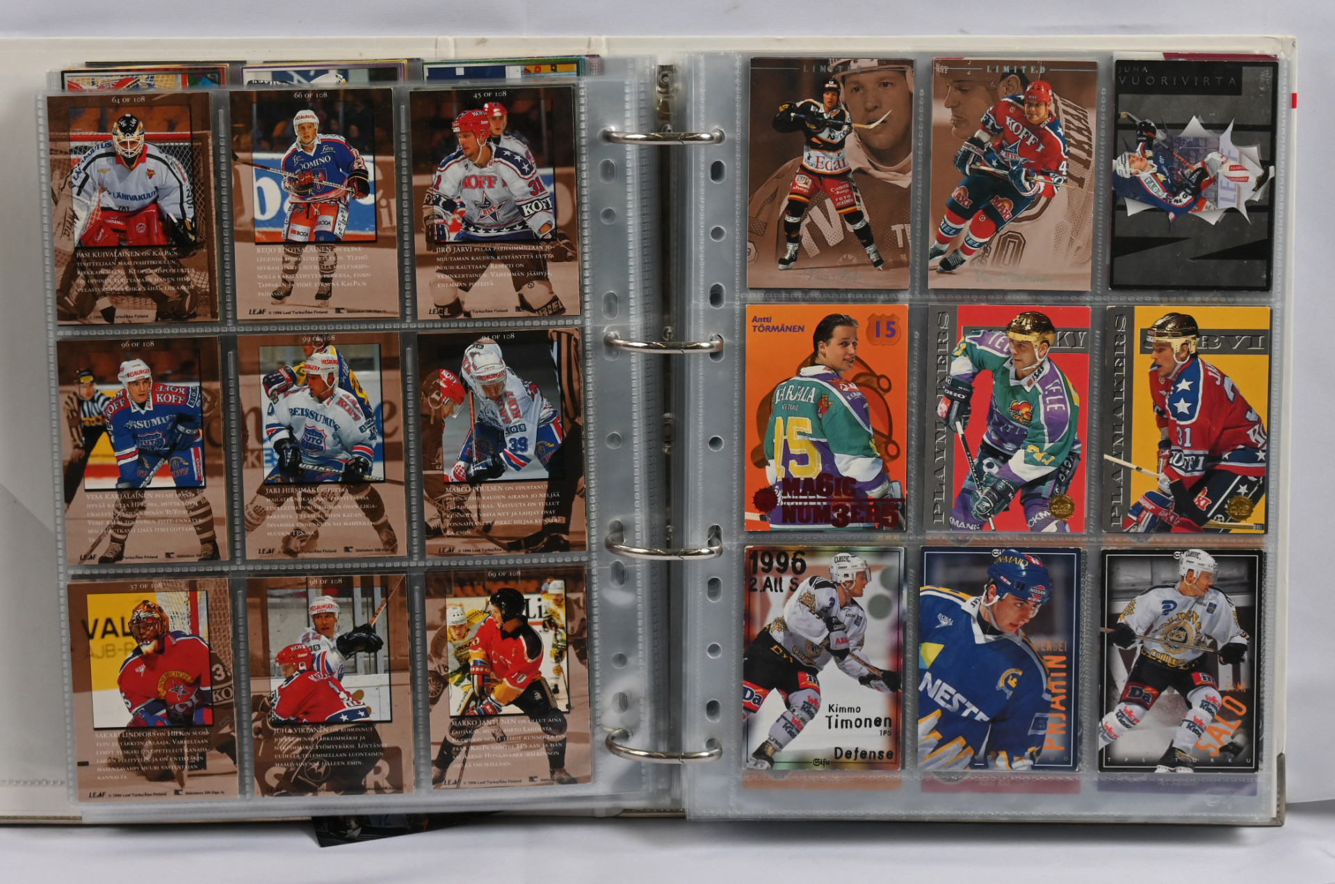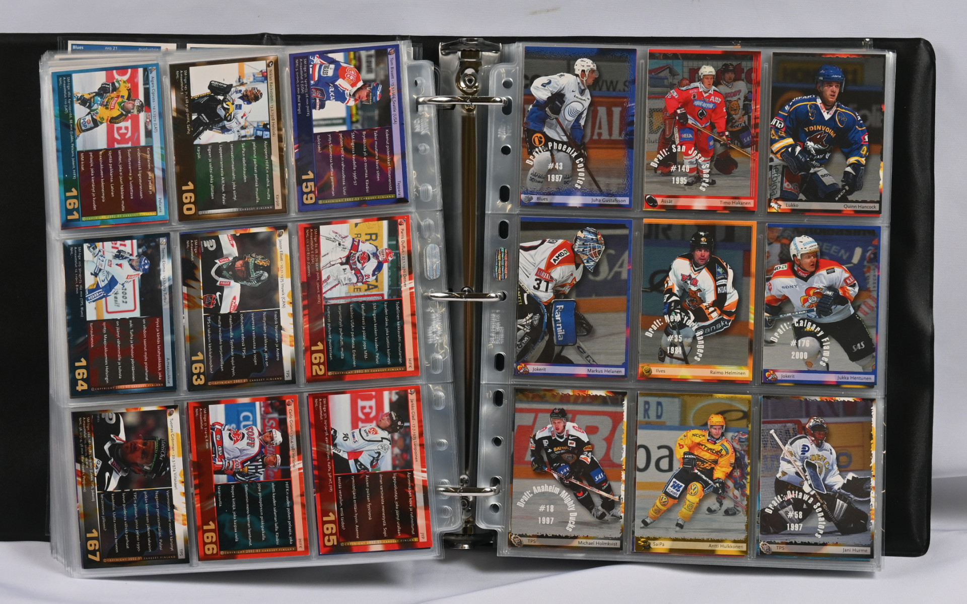 Sm-liigan kortteja iso erä 17 erikokoisessa albumissa. Pääosin 1990-luvun materiaalia mutta myös hiukan 2000-lukua. Mukana mm. 1994-95 Sisu Saku Koivu Signature (vikaa)
