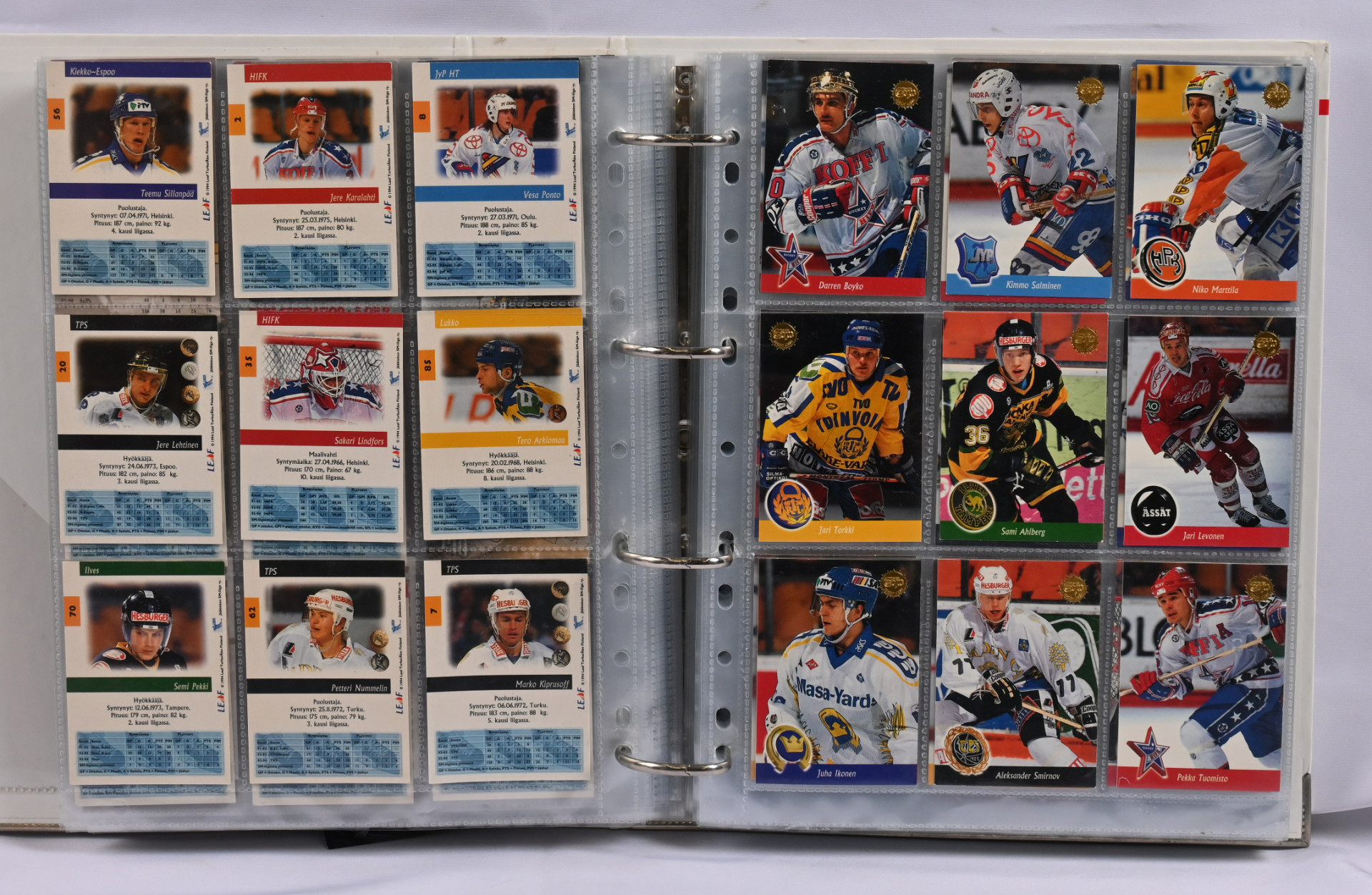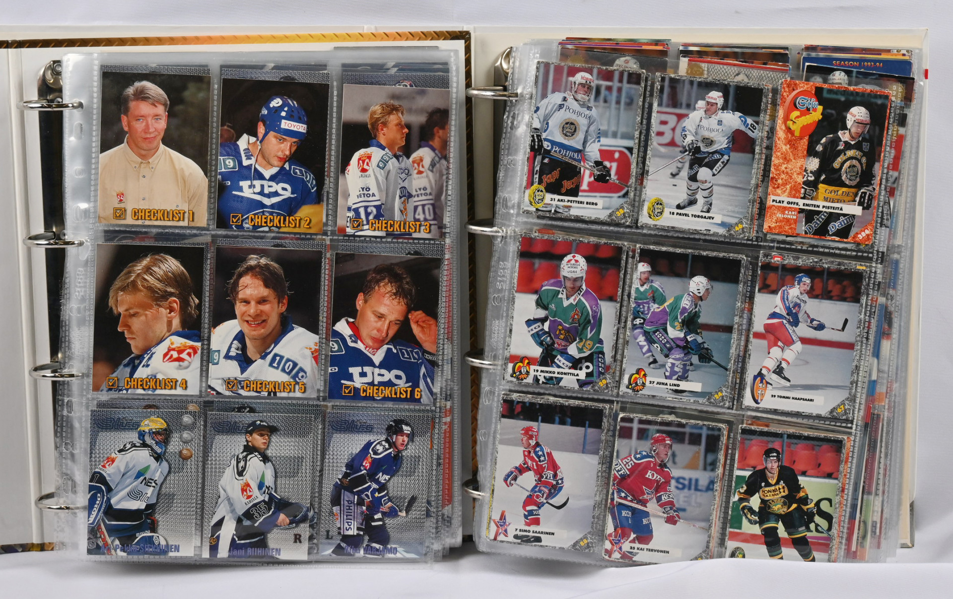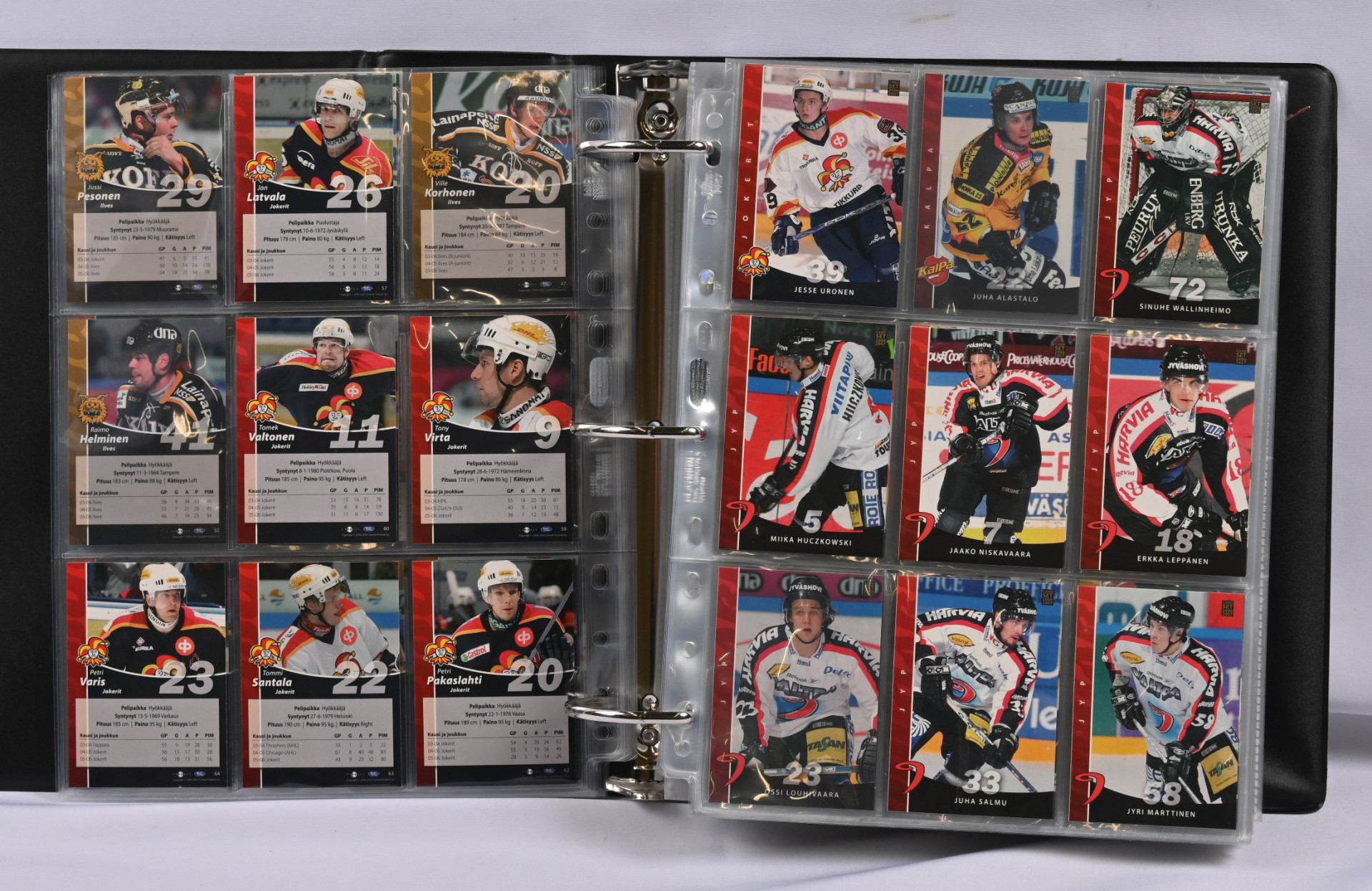 Sm-liigan kortteja iso erä 17 erikokoisessa albumissa. Pääosin 1990-luvun materiaalia mutta myös hiukan 2000-lukua. Mukana mm. 1994-95 Sisu Saku Koivu Signature (vikaa)