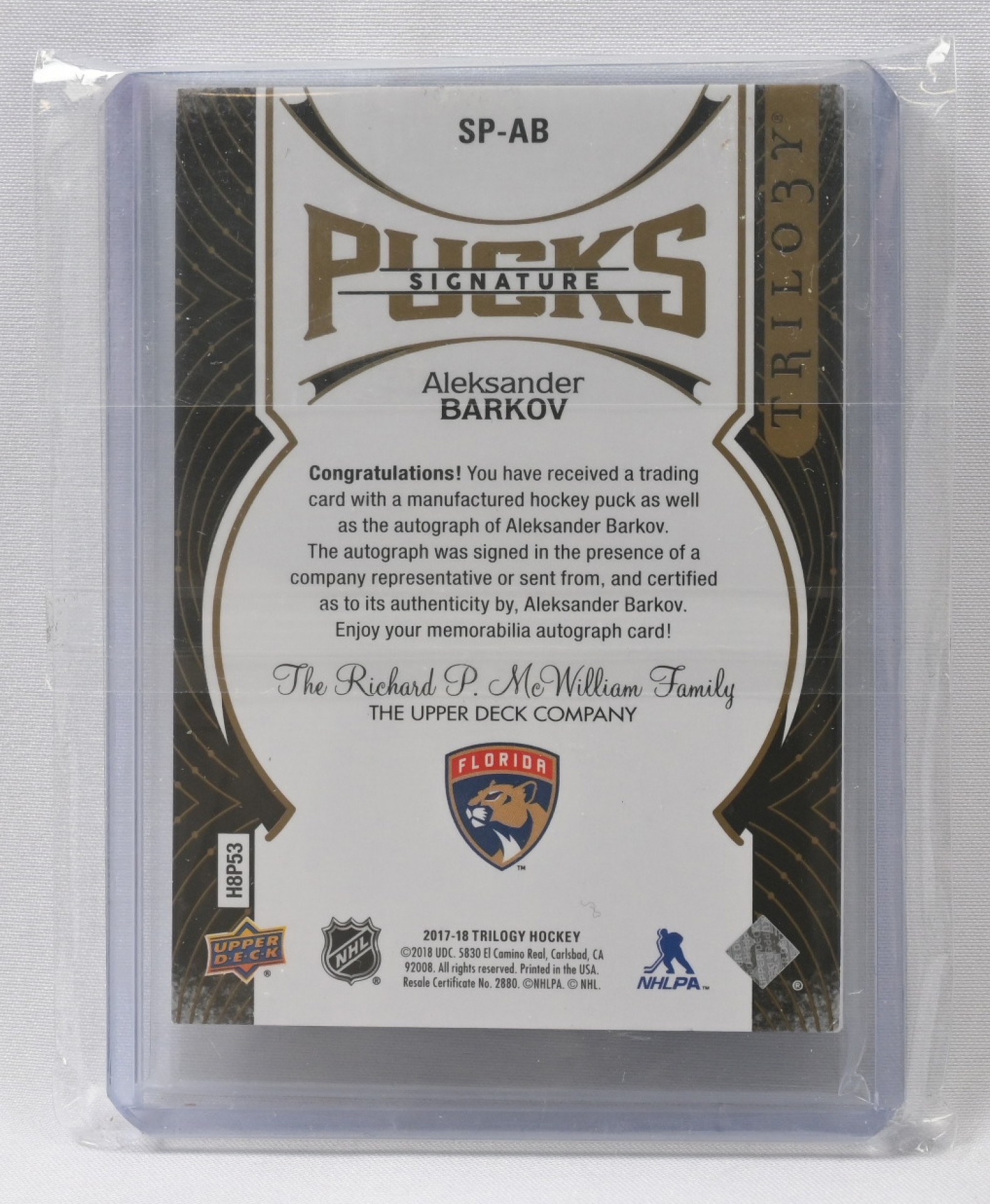 Upper Deck NHL Trilogy 2017-18 SP-AB Aleksander Barkov Signature Pucks 18/18