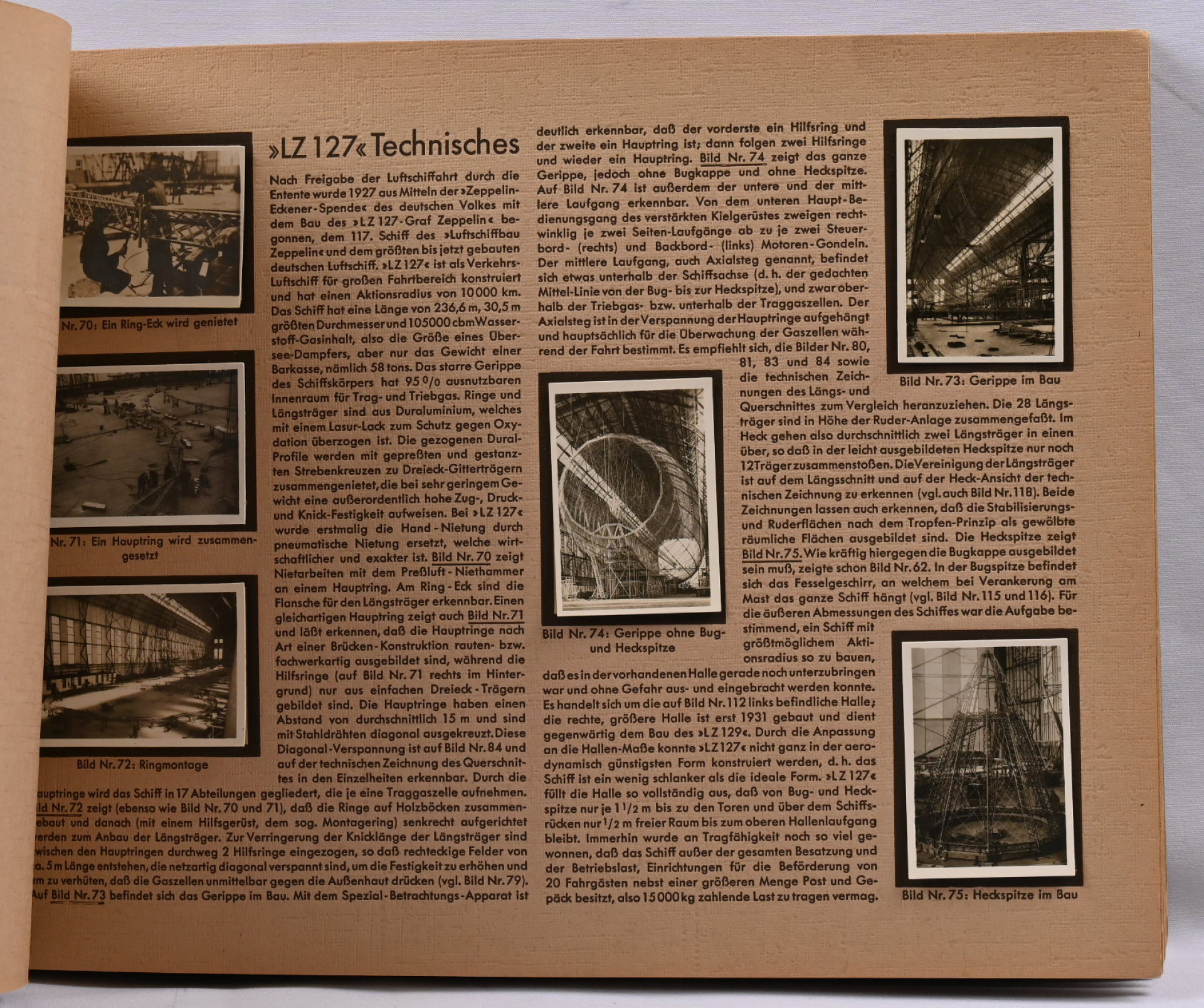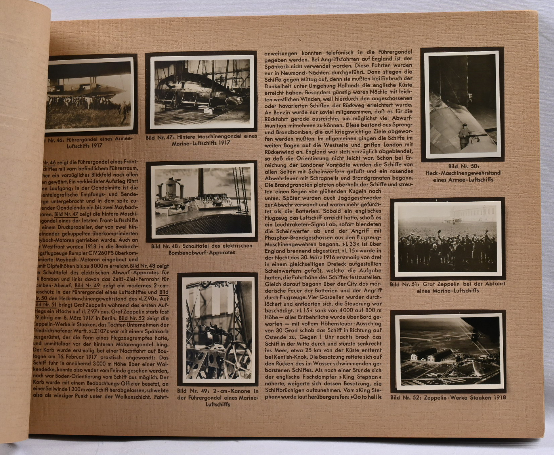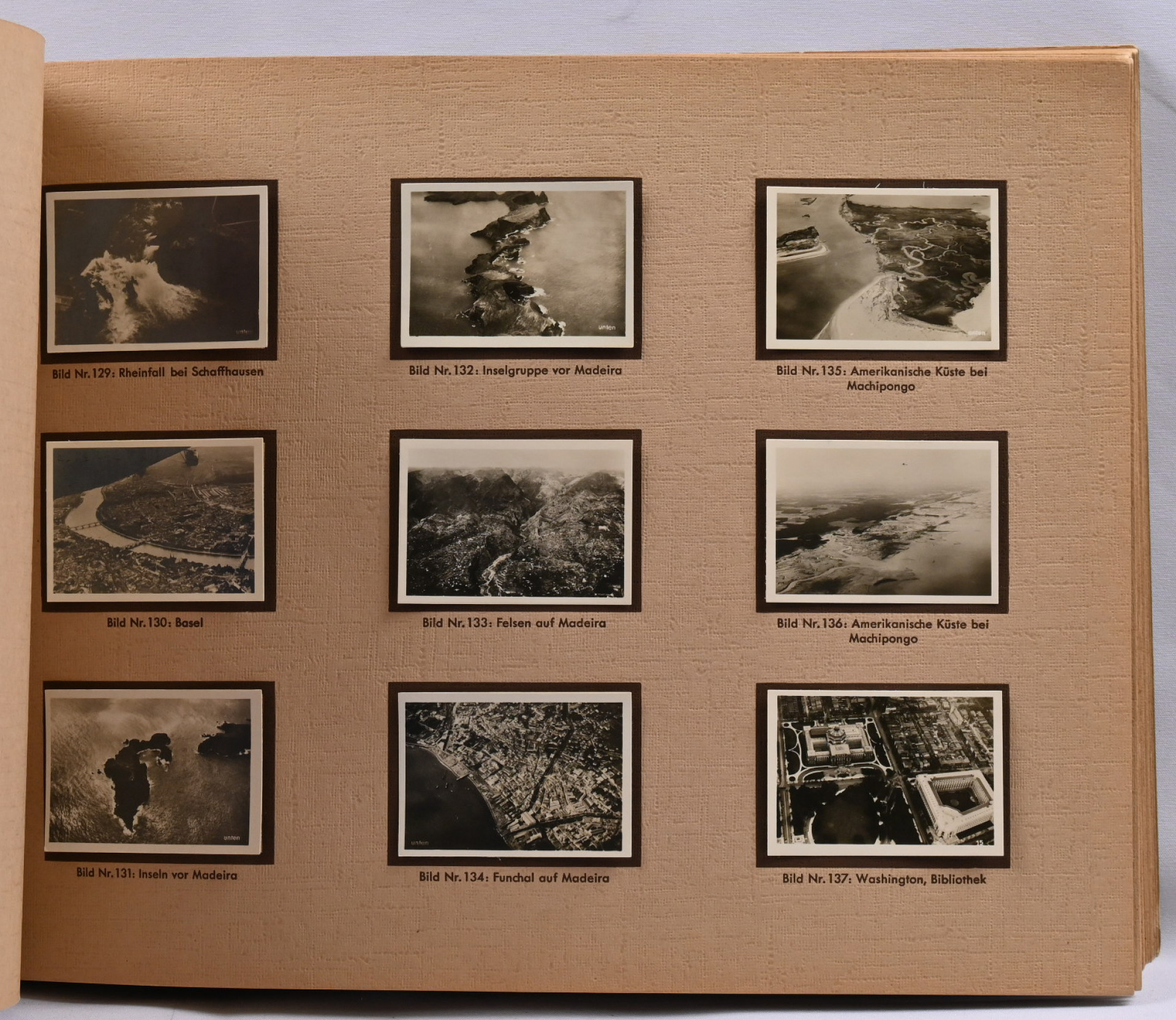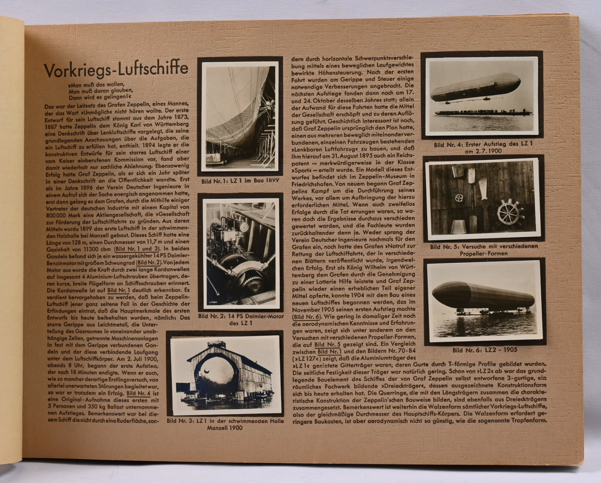 Keräilykuva-albumi ”Zeppelin-Weltfarten” I osa. Hieno valokuvakirja, sisältö ja valokuvat käytännössä virheettömiä (keräilykuvat, aidot hopea-bromidivalokuvat) ilmalaiva LZ 127 Graf Zeppelinistä v. 1932. Kirjassa kaikki 264 kuvaa. Kantta väritetty ja muutamassa sivussa repeämiä, silti hyväkuntoinen.