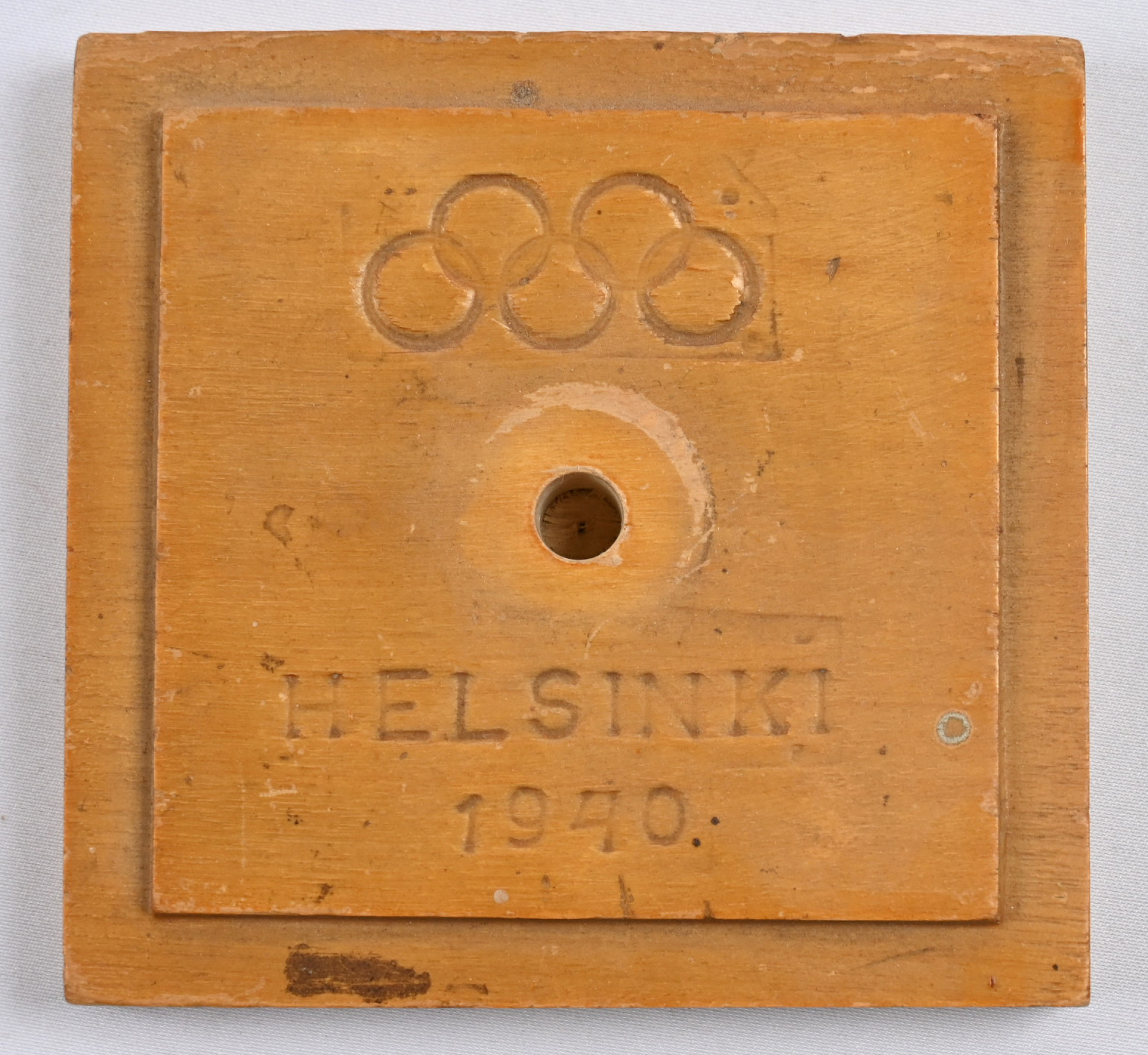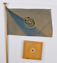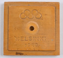 Puinen lipputanko, jossa kaiverrettu olympiarenkaat ja ”Helsinki 1940”. Korkeus noin 50 cm Helsingin Toverien (1916) vanha lippu.