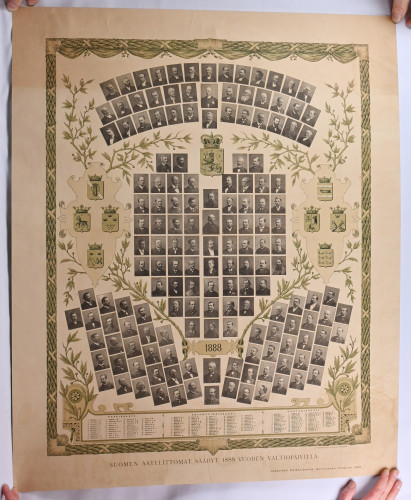 Suomen aateliittomat säädyt 1888 vuoden valtioäivillä. Koko noin 56 x 70 cm. Tavanomaista ajan patinaa