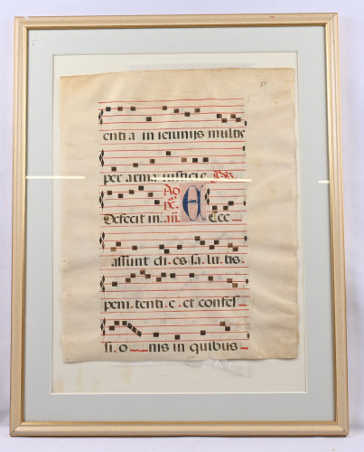 1600-luvulta (ehkä jopa 1500-luvun puolelta) vanha pergamentin sivu kehystettynä. Koko noin 49 x 39 cm. VAIN NOUTO