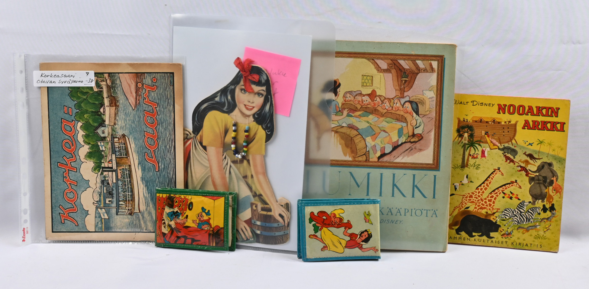 Disney ym satumaailmaan liittyviä esineitä erä mm. 1946 Lumikki ja seitsemän kääpiötä kirja ym