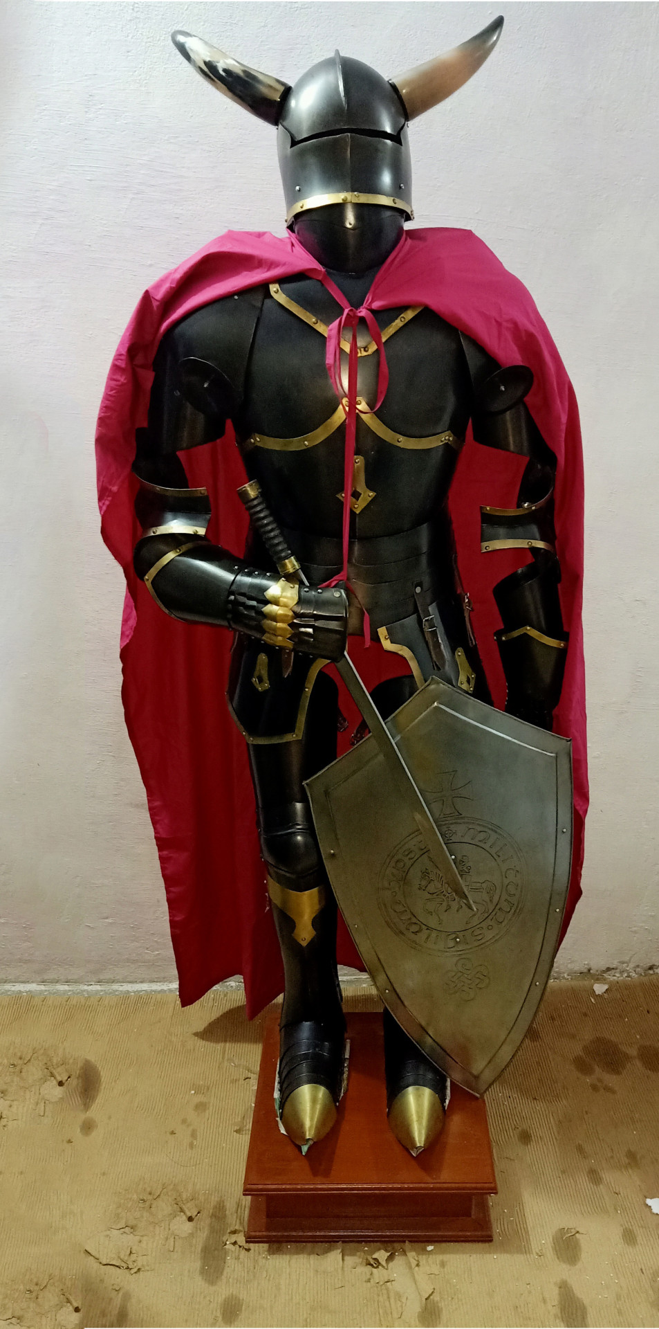 Haarniska, 1400-luvun goottiritarin haarniskan replika miekalla ja kilvellä puujalustalla, 198 cm korkea, paino n. 35 KG, NMA-016, käsintehty. Haarniska toimitetaan kokoamattomana