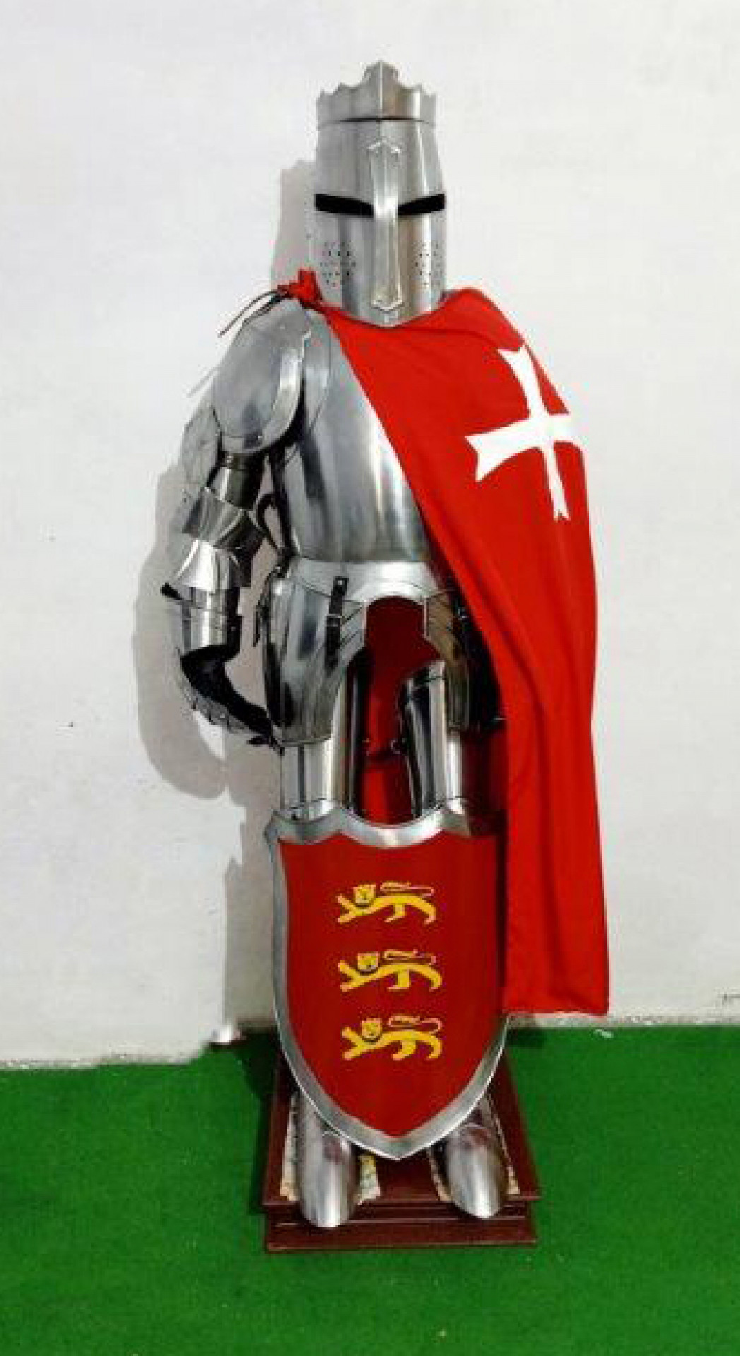 Haarniska, keskiaikainen ritarihaarniskan replika kilvellä puujalustalla, 198 cm korkea, paino n. 35 KG, NMA-06, käsintehty. Haarniska toimitetaan kokoamattomana.