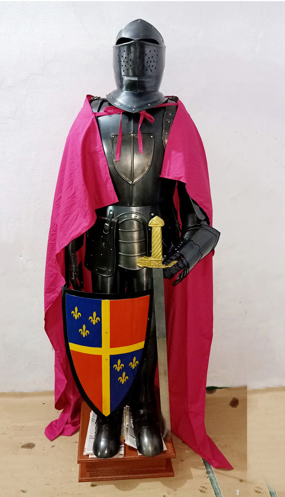 Haarniska, keskiaikaisen mustan ritarihaarniskan replika miekalla ja kilvellä puujalustalla, 198 cm korkea, paino n. 35 KG, käsintehty. NMA-02. Haarniska toimitetaan kokoamattomana. Hieno sisustuselementti!
