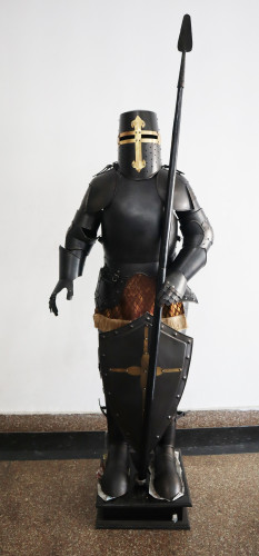 Haarniska, keskiaikaisen ritarihaarniskan replika keihäällä ja kilvellä puujalustalla, 198 cm korkea, paino n. 35 KG, FSA-001, käsintehty. Haarniska toimitetaan kokoamattomana