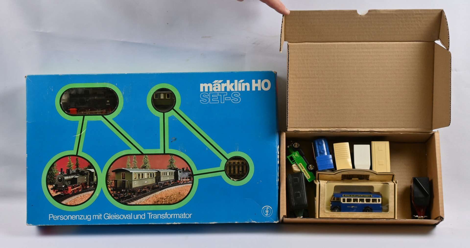 Lelut, Märklin HO Set-S laatikko osineen. Lisäksi keräilyautoja erä kahdeksan kpl