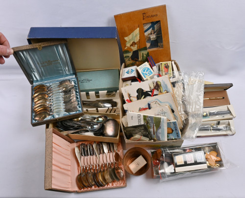 Monipuoleinen erä keräilyesineitä. Neljä rasiaa aterimia (alpakkaa), kolme kynää (mm. kullattu Cross-kuivamustekynä), tulitikkurasioita, pussillinen paperisinettejä/pääsylippuja ym. paperitavaraa, uudempia pinssejä ym.