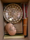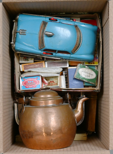 Sekalainen erä keräilyesineitä, mm. Punaisen Ristin hihanaula ja muita tekstiilejä, vanha barometri, pieni kuparipannu, peltinen leluauto (ruostetta), tulitikkurasioita, neuvostoliittolaisia pinssejä yli 50 kappaletta, kaksi vanhaa partaveistä, painava lasinen valokuvakehys, iso nippu ruotsalaisia ostokortteja ym.