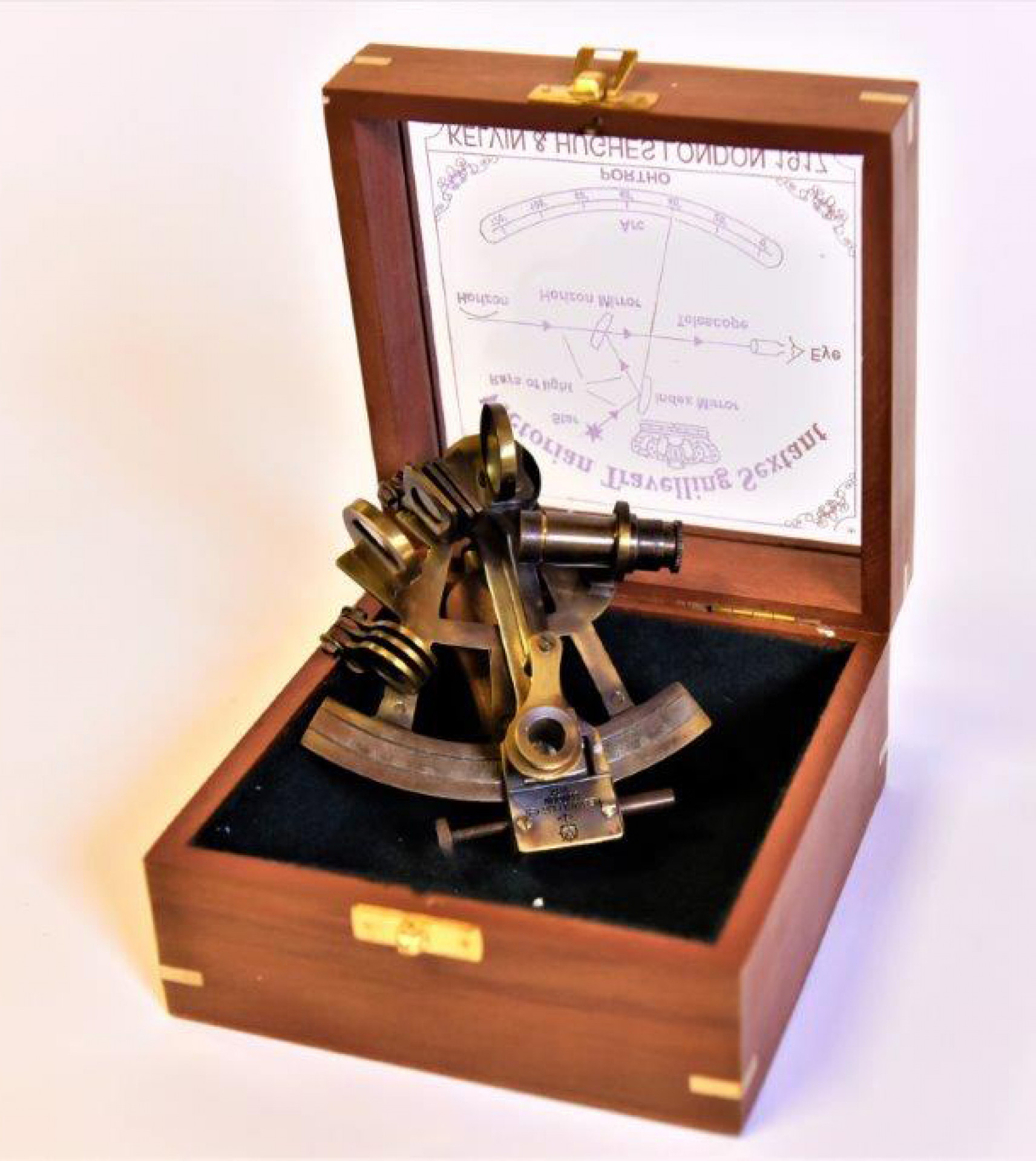 Sekstantti puisessa laatikossa, messinkiä. Replika, uusi