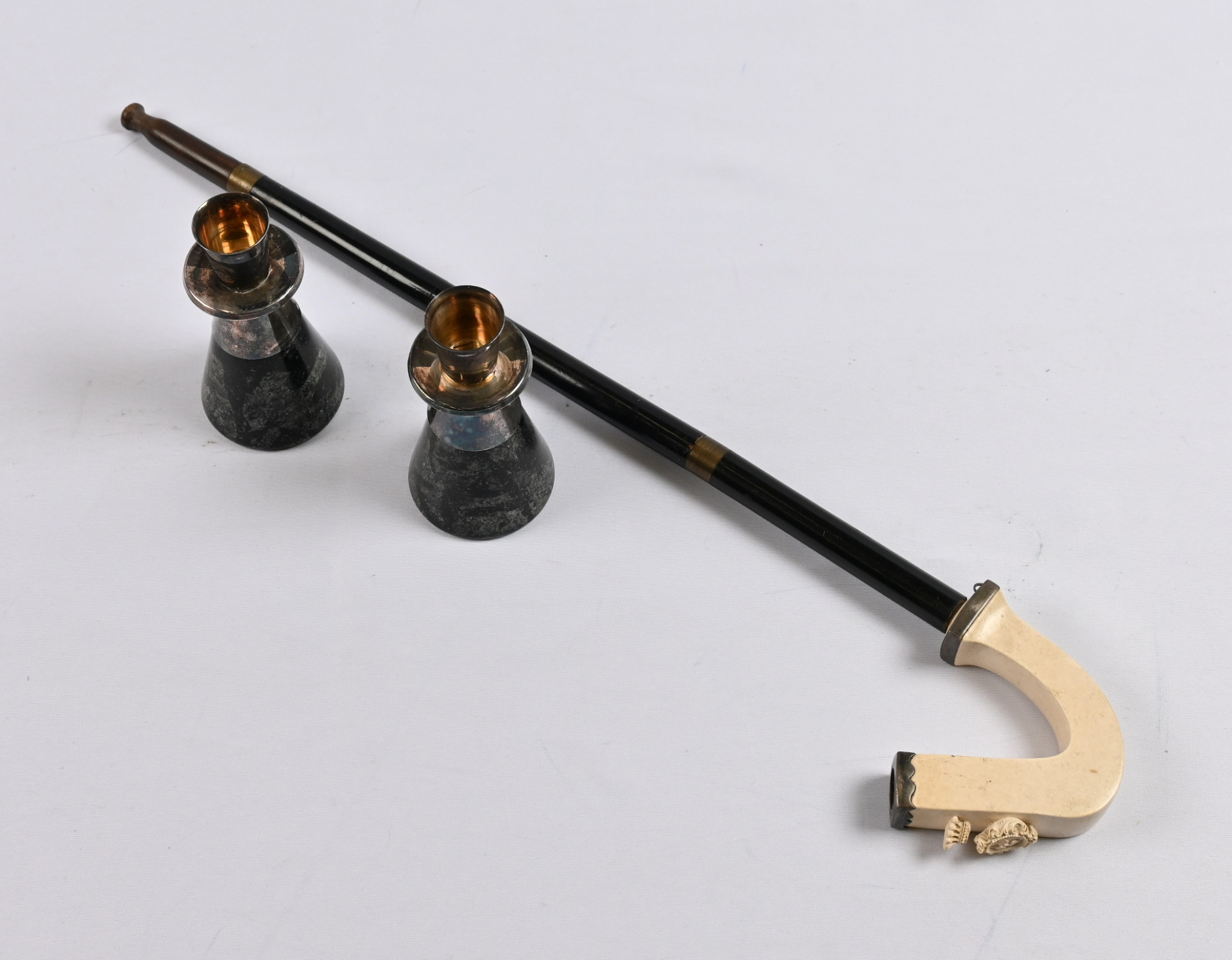 Vanha piippu ja kynttilän jalat, jotka osittain hoeaa. Tavanomaista käyttökulumaa