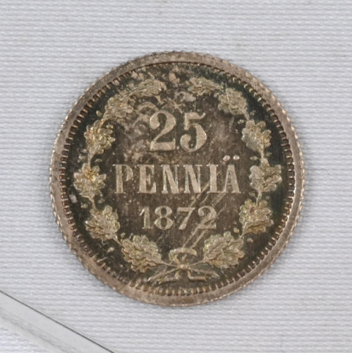 SUURI HARVINAISUUS: 1872 25 penniä II myöhempi lyönti, tiheäjuovainen vaakuna, peilipinta, tummunut, kl 01. Tunnetaan ilmeisesti vain viisi kpl!